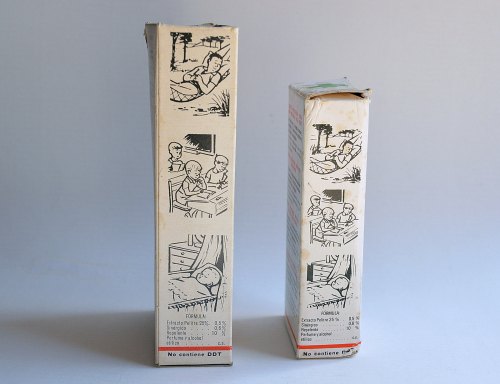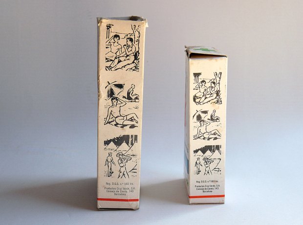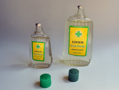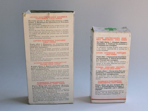 He tenido la ocasión de hacerme con un par de frascos de la Loción Higiénica Cruz Verde, producto al que dediqué tiempo atrás una entrada [1]. Fue uno de los antiparasitarios más vendidos en España. Tuvo una vida comercial entre 1945 y finales de la década de 1970. No sé en qué momento Cruz Verde dejó de comercializarlo. Como cualquier otro producto tuvo una evolución que explicaré un poco en esta entrada. En las imágenes se pueden ver los dos tamaños en los que se comercializaba la loción. No sabría decir el contenido exacto que hay en cada envase, porque no aparece el dato. Diría que el frasco pequeño contiene unos 60 milílitros. Y el grande, el doble. Si tuviera que situarlos en el tiempo, diría que es de principios de la década de 1970. Un detalle importante es que en un lateral de la caja aparece la frase «no contiene DDT» (figura 5). Importante este dato y explicaré el porqué.
