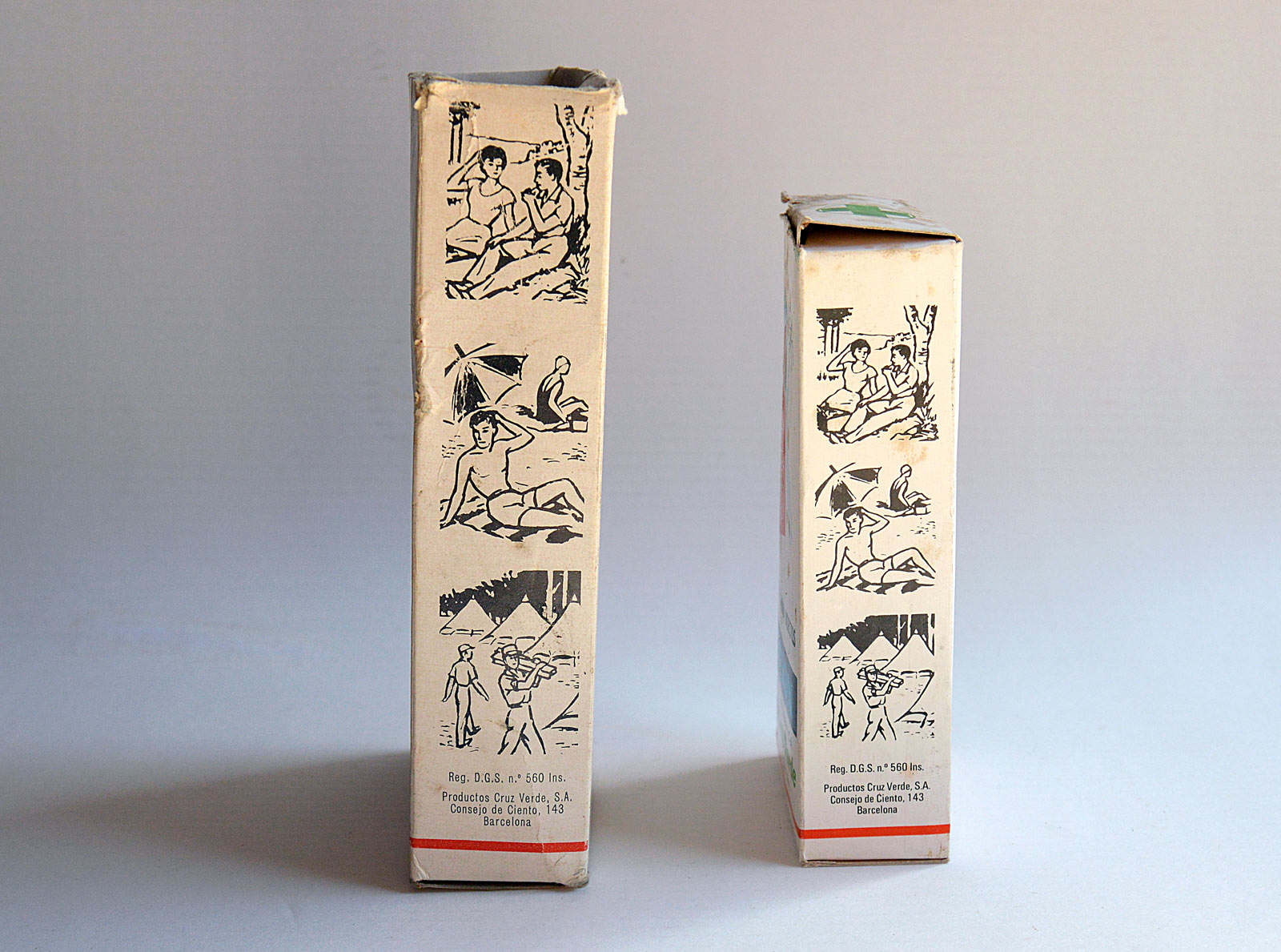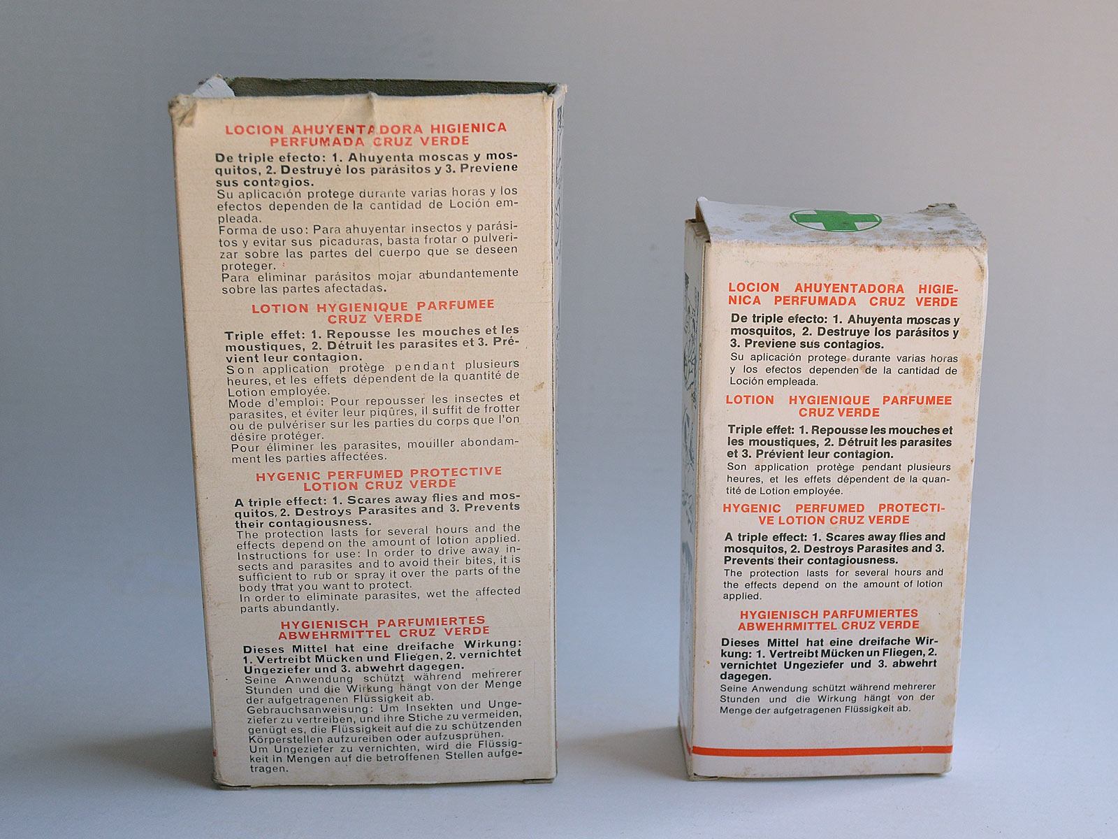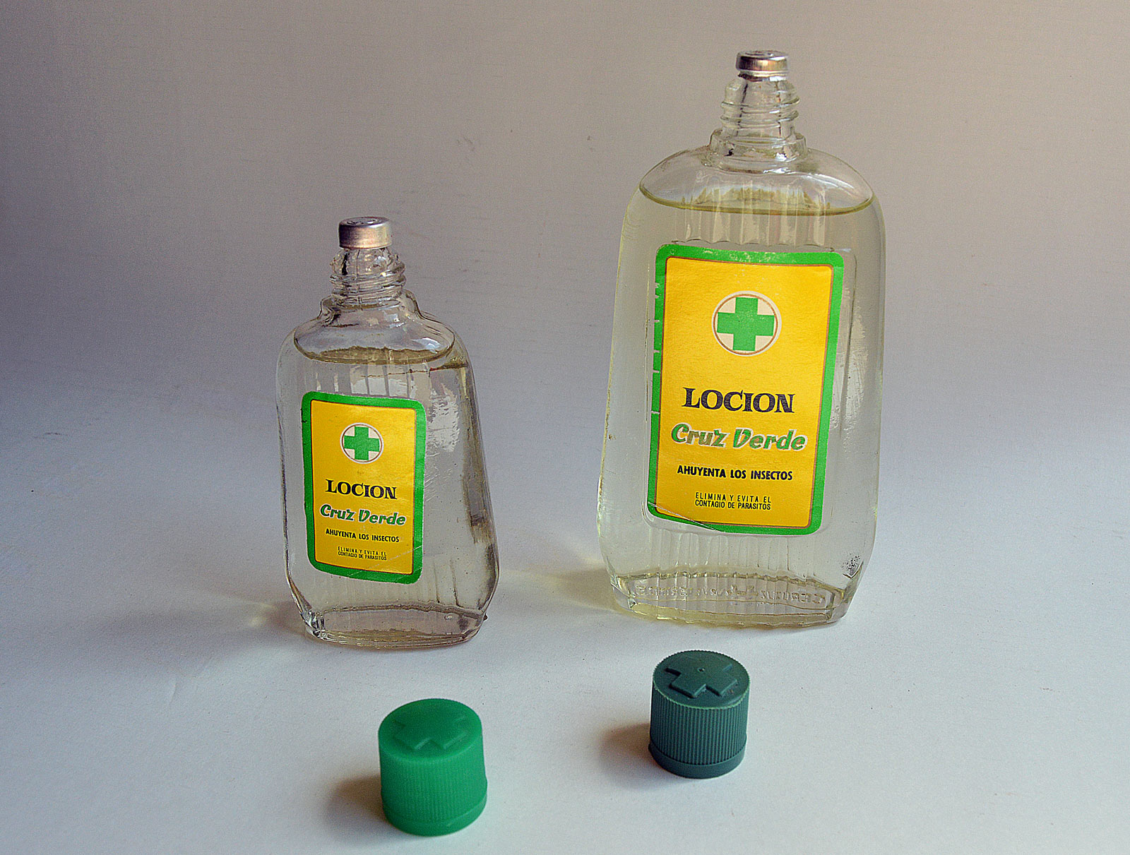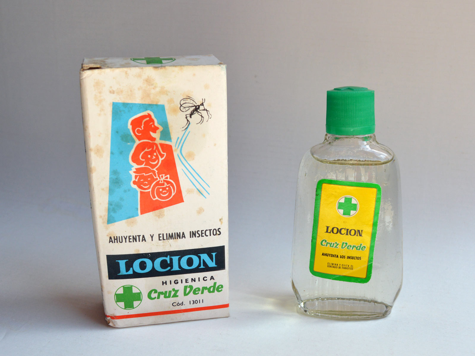 En 1957, Cruz Verde mejora su loción higiénica. En un anuncio publicado en el periódico La Vanguardia la loción aparece adjetivada con la palabra nueva y es definida como «una armadura contra los insectos» [6]. En un párrafo se dice esto: «Su acción repelente es una novedad que presenta este año Cruz Verde por haber incorporado a la loción un nuevo componente que actúa, con sorprendentes efectos, como ahuyentador de insectos.» En el catálogo de 1958 [7] se dice: «Su acción está reforzada con un nuevo producto, que permite mantener sus propiedades ahuyentadoras hasta más de ocho horas a partir de su aplicación.» Muy interesante este punto, porque si tenemos en mente la historia de los repelentes, hacia 1957 el DEET (N,N-dietil-meta-toluamida) se empezó a formular en productos para uso por el público en general [8]. Esta es una de las mejores sustancias repelentes descubiertas y pantentada por el US Army en 1946 para luchar contra los mosquitos portadores de enfermedades y causantes de numerosas bajas de soldados. Cabe la posibilidad de que Cruz Verde se hiciera con los derechos de este producto para incorporarlo a su loción.