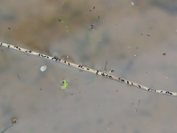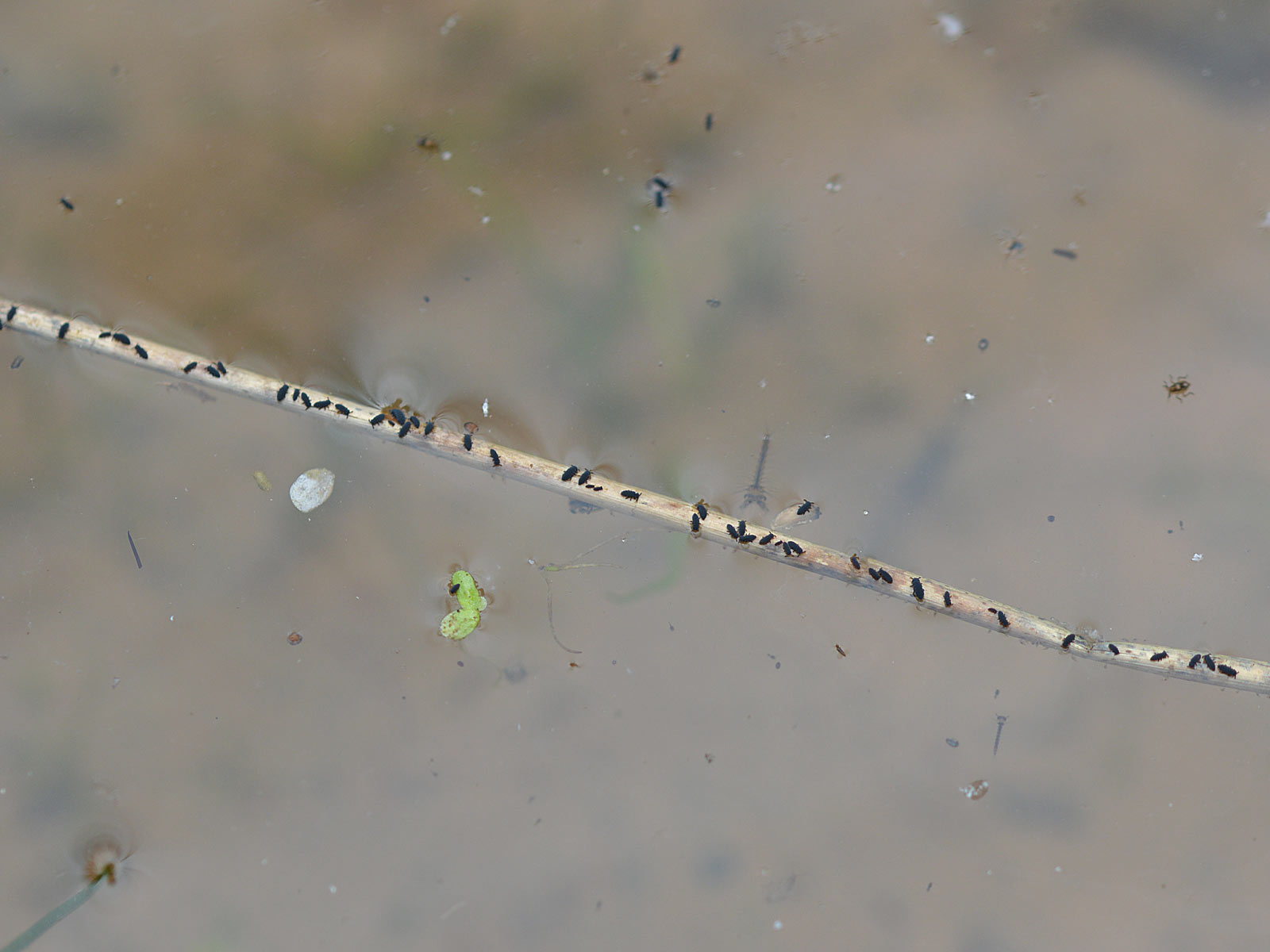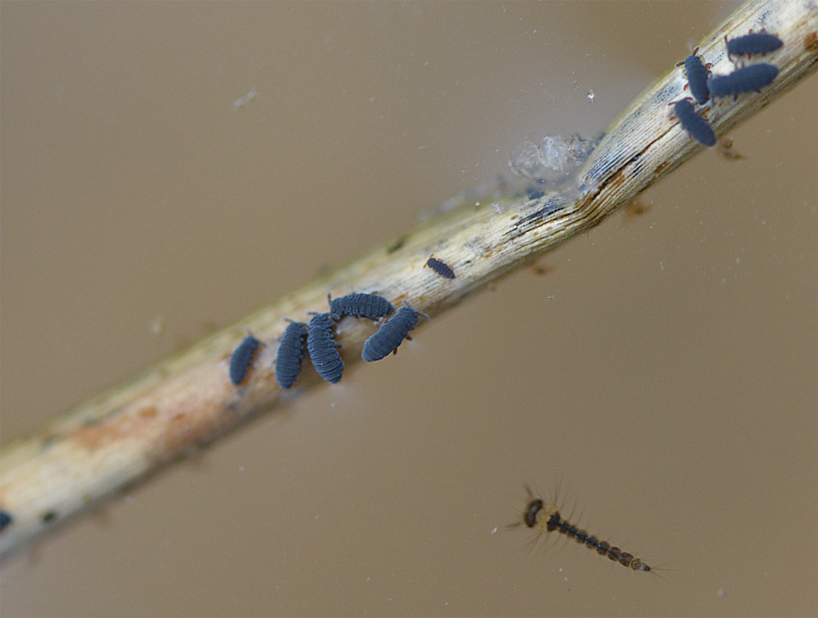 En varias ocasiones he visto colémbolos (Collembola) sobre agua como los que se pueden ver en las imágenes. Sin embargo, en esta ocasión me entretuve en fotografiar tan bonitos y pequeños insectos. Es difícil la determinación de los colémbolos. Pero teniendo en cuenta su aspecto y que se encontraban sobre agua, probablemente pertenezcan a la especie Podura aquatica.