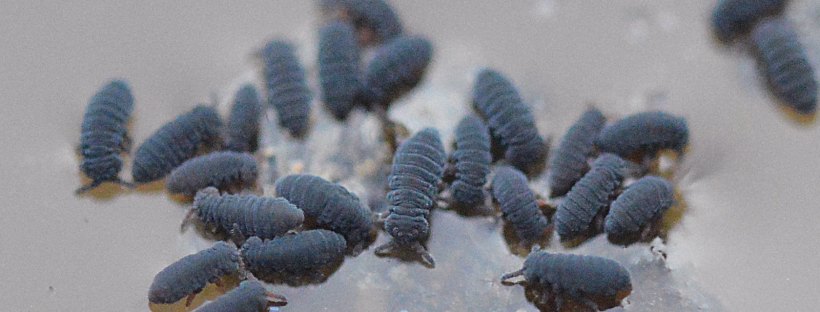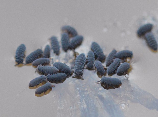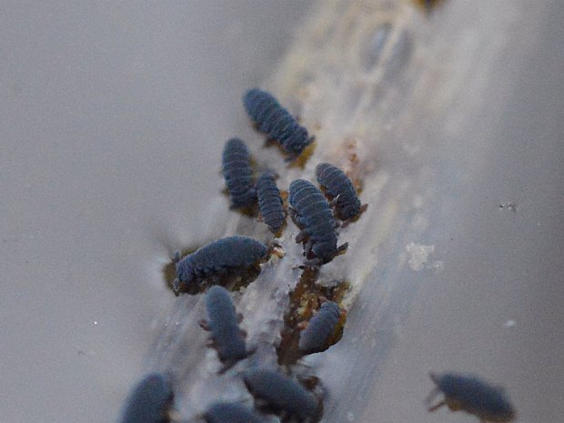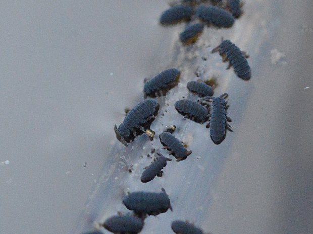 Estos colémbolos me parecen un rebaño de vacas que pacen en un prado. Tienen una forma regordeta y una actitud gregaria. En una ocasión, los vi en el agua encharcada que había en un registro de aguas pluviales de una casa en Roda de Ter. Abrí la tapa situada en el patio interior para ver si había cucarachas y encontré toda una lámina azul grisácea de colémbolos. Su aspecto es muy diferente a la de otros colémbolos que rondan por nuestras casas. Sin embargo, disponen también del resorte con el que son capaces de saltar. Los colémbolos son artrópodos abundantes en el suelo y necesarios. Abundan durante otoño e invierno. Aguantan bien el frío. Y durante el verano casi desaparecen.