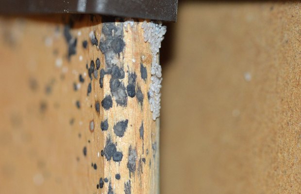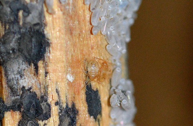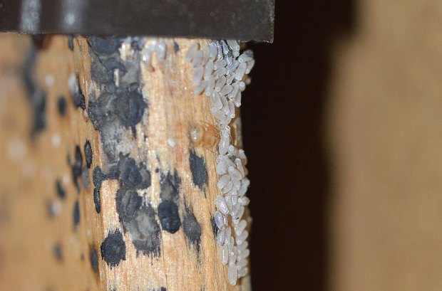 En las imágenes de esta entrada, se puede ver el extremo de una de las lamas de madera del somier infestado que me encontré en la residencia antes mencionada. Se trata de la zona donde la madera queda anclada a la estructura de hierro mediante una agarradera de plástico. Es un lugar ideal para que las chinches completen todo su ciclo de vida. Viendo la imagen número 1, en la que destacan numerosas manchas de excrementos, uno ya se da cuenta de que la infestación es grande. Todas las lamas del somier tenían un aspecto parecido.