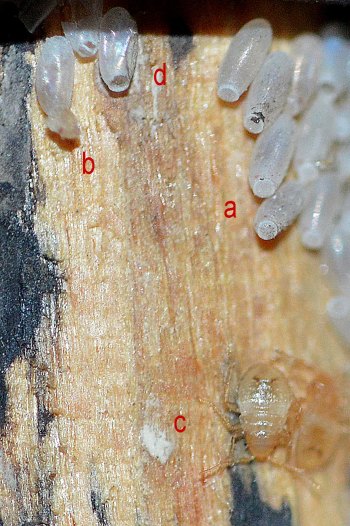 El objetivo macro que utilizo tiene sus limitaciones. Así que no he podido conseguir unas imágenes tan nítidas como desearía, aunque sí son ilustrativas. Interesante es la imagen número 3, en la que he indicado mediante letras diferentes detalles que se pueden apreciar. La letra ‘a’ indica los huevos con el embrión en gestación. Si se amplia la imagen, se podrán ver unos puntitos rojos cerca del opérculo que parecen ser los ojos de la futura chinche. Junto a a letra ‘b’ se puede ver apreciar una chinche saliendo del huevo. La imagen está poco nítida en esta esquina. La letra ‘c’ está junto a un par de chinches que han salido del huevo, pero que todavía no han ingerido su ración de sangre. Y con la letra ‘d’ se señala un par de huevos vacíos. Uno ha perdido el opérculo y otro lo conserva. Para acabar, comentar que si se quieren ver las imágenes con mayor resolución, tan solo hay que clicar sobre estas.
