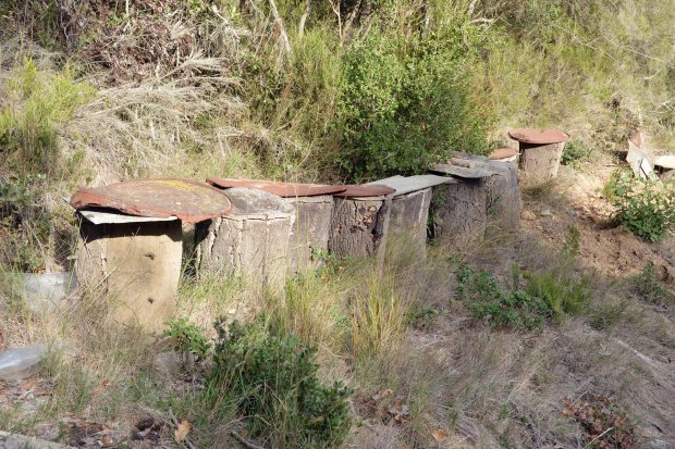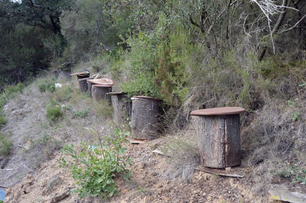 El pasado domingo encontré un colmenar viejuno en Vallgorguina, pueblo del Vallès Oriental que se encuentra sobre los 200 metros de altitud. Paseaba con mi mujer por las cercanías cuando vimos en la ladera de una montaña una línea de colmenas de corcho (figura 1). Estaban orientadas al sol del mediodía. Parecían abandonadas y por el aspecto llevaban muchos años descuidadas. Sin embargo, en un colmena parecía que aún resistía una colonia de Apis mellifera.