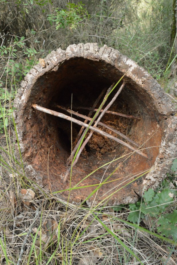 La apicultura tradicional hacía uso de los materiales que tenía a mano para construir colmenas. Las había de cerámica, tejidas con fibras vegetales, a base de un tronco hueco o de corteza de alcornoque como las que encontré. El corcho se cosía con ramas o cuerda. La tapa, llamada témpano, era también de corcho y se usaban ramitas a modo de clavos para fijarla. Para proteger la colmena de la lluvia y darle resistencia ante el viento se colocaba una losa delgada o cualquier otro objeto plano. La colmena se asentaba sobre una losa.