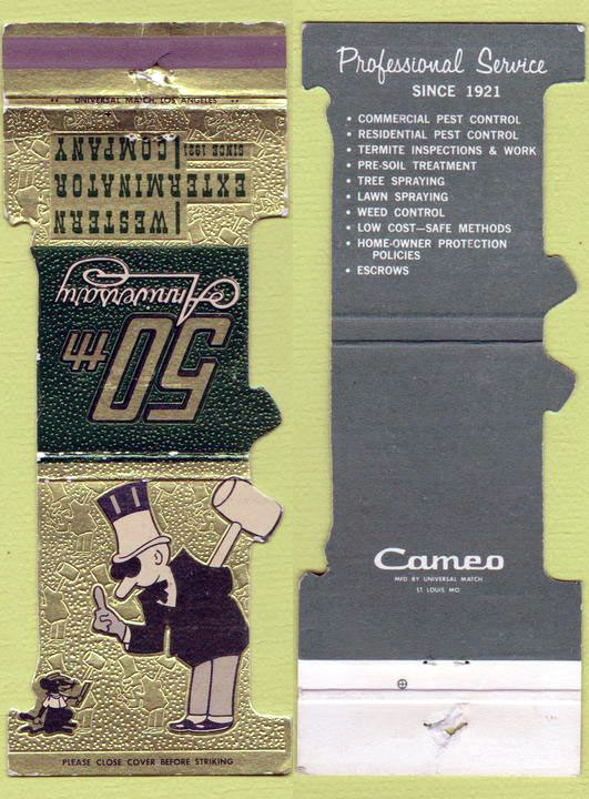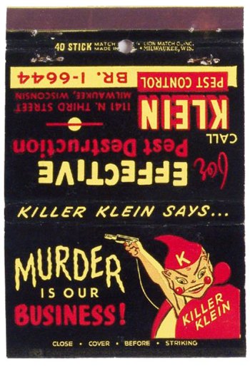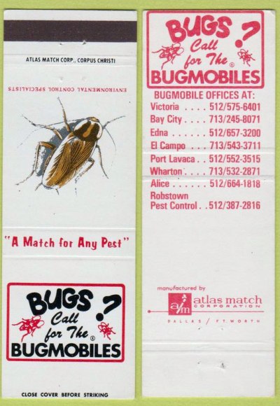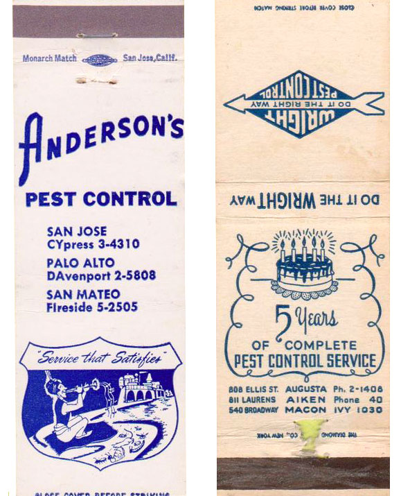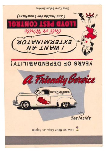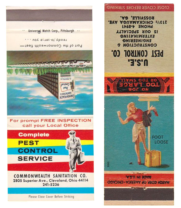 Buscando en la Ebay de EUA, he encontrado algunas imágenes de matchbooks con publicidad de empresas de control de plagas. Antaño el librito de cerillas era un buen regalo para dar al cliente. Un producto vistoso que el fumador hacía circular. No sé yo cuando empezó el declive del librito de cerillas. Quizás fue cuando empezó la era de los mecheros de plástico tipo Bic o Clipper. De hecho los mecheros Bic parecían estar diseñados para llevar publicidad.
