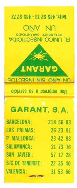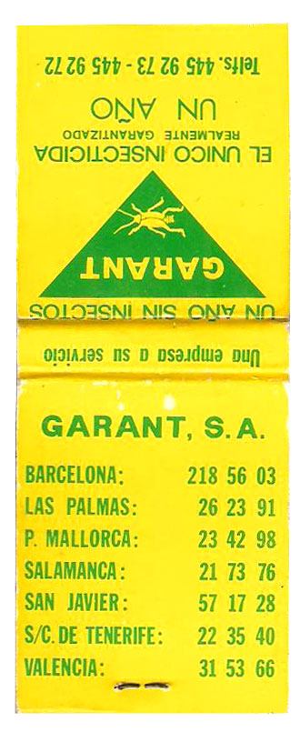 En este posteo se pueden ver imágenes de cubiertas de libritos de cerillas. Unos tienen una estética más antigua y otros más moderna que yo situaría entre la década de 1950 y la de 1980. Todos los libritos son norteamericanos a excepción del primero, que es el único que he encontrado de una empresa española. Como sabrán, Garant fue una empresa importante que tuvo un fuerte crecimiento en la década de 1970 gracias a las lacas insecticidas.