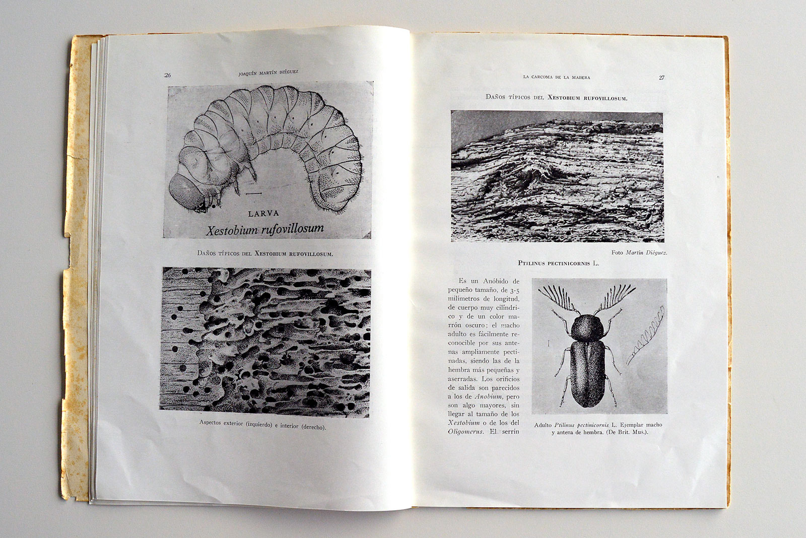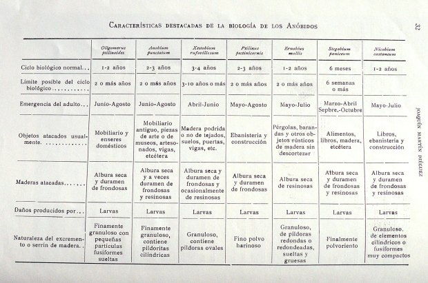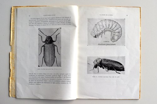 ‘La carcoma de la madera y métodos para combatirla’ fue publicada en 1960 por la Dirección General de Montes, Caza y Pesca Fluvial, dependiente del Ministerio de Agricultura. Consta de 58 páginas divididas en dos partes. En la primera, se describen los anóbidos (Anobiidae) que afectan a la conservación de la madera y, en la segunda, los métodos empleados en la época para neutralizarla. Se describen 7 carcomas que son las comunes en la Península Ibérica: Oligomerus ptilinoides, Anobium punctatum, Xestobium rufovillosum, Ptilinus pectinicornis, Ernobius mollis, Nicobium casteneum y Stegobium paniceum. Curioso es que aparezca en último lugar de la lista la carcoma del pan (S. paniceum), ya que se trata de un coleóptero que ocasiona daños en los productos almacenados. El autor comenta que «accidentalmente ataca también madera de pino, libros, archivadores, etc.» Lo cierto es que no me he encontrado hasta el momento una madera atacada por este anóbido. Pero a partir de ahora, estaré al más receptivo por si se tercia la ocasión de verlo.