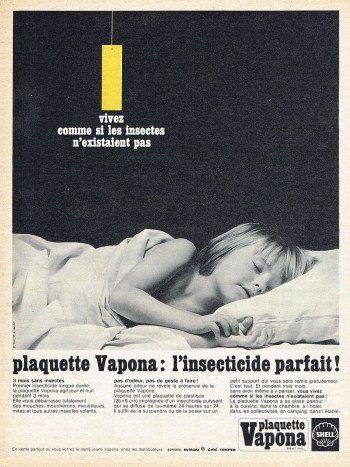 En la imagen número 5 se puede ver un anuncio de 1968 que pretende mostrar el grado de protección y bienestar que ofrecen las tiras insecticidas. Como en muchos anuncios de insecticidas se hace uso y abuso de una estampa maternal. En el texto, se puede leer que «el producto Vapona, contenido en la tira, es desprendido en forma de nube invisible que busca y mata los insectos. Sólo hay que abrir el sobre y colgarla.» Cada tira medía 25 x 6 centímetros. Su radio de acción cubría cerca de 28 metros cuadrados durante 3 meses. Ahí es nada. En el anuncio se remarca que es «inodora, altamente higiénica, inocua.» En anuncios parecidos publicados en todo el mundo, se usó la imagen del niño que es protegido por la tira vaporizante. En la imagen número 6, se puede ver un anuncio de 1967 publicado en la prensa francesa. Tiene un diseño soberbio.