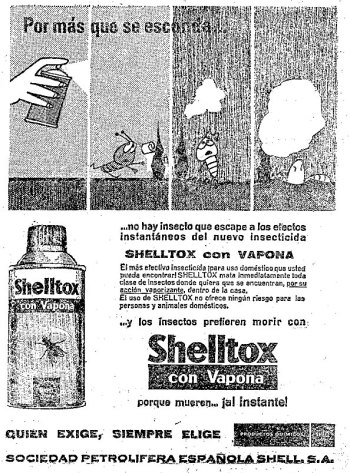 He buscado datos sobre la introducción del diclorvós en España. Los primeros anuncios en prensa escrita aparecieron en 1965. En la imagen número 4, se puede ver uno publicado en mayo de 1965. Se anuncia Shelltox con vapona en bote de aerosol. Se remarca su acción vaporizante e instantánea. Y se dice que su uso «no ofrece ningún riesgo para las personas ni animales domésticos.» A partir de 1967, la filial española de la Shell Oil, la Sociedad Petrolífera Española Shell SA, lanzó una importante campaña para dar a conocer las tiras vaporizantes Shelltox. Fueron publicados anuncios en los periódicos más importantes durante un par de años.