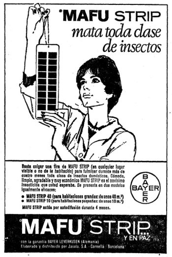 En un anuncio de 1967 (figura 7) se afirma que «si durante 3 segundos 500.000 españoles utilizaran Shelltox con Vapona (en aerosoles o en tiras vaporizantes), en pocas horas morirían todas las moscas, mosquitos, cucarachas y el resto de los insectos domésticos que hay en el país.» No hace falta añadir que, si se hubiera hecho esto, rápidamente se habrían percatado de la toxicidad del producto para las personas. En fin, ya sabemos de donde venimos. Pero no solo Shell tuvo sus tiras vaporizantes. Bayer comercializó las suyas bajo el nombre de Mafu Strip (figura 8). Este producto apareció en España hacia 1969 fabricado y comercializado por Jasala. Desconozco si estas tiras tuvieron mucho éxito.