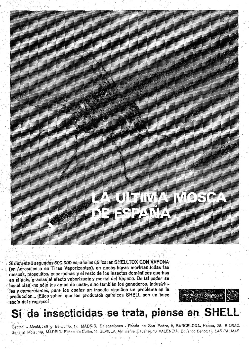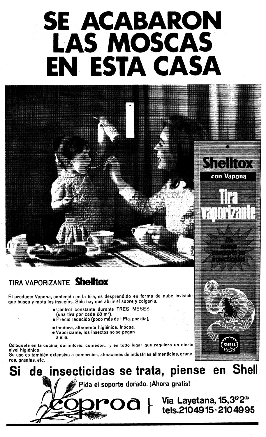 He buscado datos sobre la introducción del diclorvós en España. Los primeros anuncios en prensa escrita aparecieron en 1965. En la imagen número 4, se puede ver uno publicado en mayo de 1965. Se anuncia Shelltox con vapona en bote de aerosol. Se remarca su acción vaporizante e instantánea. Y se dice que su uso «no ofrece ningún riesgo para las personas ni animales domésticos.» A partir de 1967, la filial española de la Shell Oil, la Sociedad Petrolífera Española Shell SA, lanzó una importante campaña para dar a conocer las tiras vaporizantes Shelltox. Fueron publicados anuncios en los periódicos más importantes durante un par de años.
