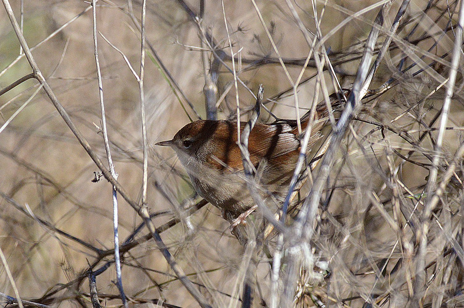 El ruiseñor bastardo (Cettia cetti) es uno de los pajarillos que más me gusta [1]. Es un ave mediterránea que se desarrolla junto a cursos de agua si estos poseen algo de vegetación ribereña. No pide una arboleda ni nada parecido, sino que se conforma con arbustos donde cobijarse. Tengo la suerte de vivir cerca del río Besós donde abunda y se puede oír su canto sencillo y gritón. Parece mentira cómo un ave de unos 15 gramos puede alzar tanto su voz. Quizás sea el efecto acústico de cantar pegado al suelo, porque es un ave que hace su vida a ras de tierra.