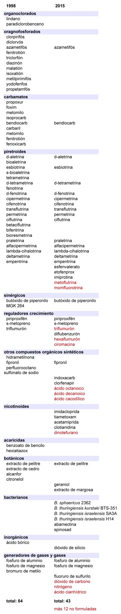En este posteo se puede ver una tabla en la que aparecen dos listas con nombres de sustancias activas insecticidas y acaricidas (TP18). A la izquierda están las sustancias formuladas en preparados comerciales que había disponibles en el mercado doméstico y profesional en 1998. Y a la derecha, está la lista de las sustancias formuladas a diciembre de 2015. La disposición de ambas listas se ha realizado para mostrar la concurrencia o no de nombres. Y de esta manera, ver fácilmente qué sustancias han desaparecido, cuáles se han mantenido y cuáles han aparecido.