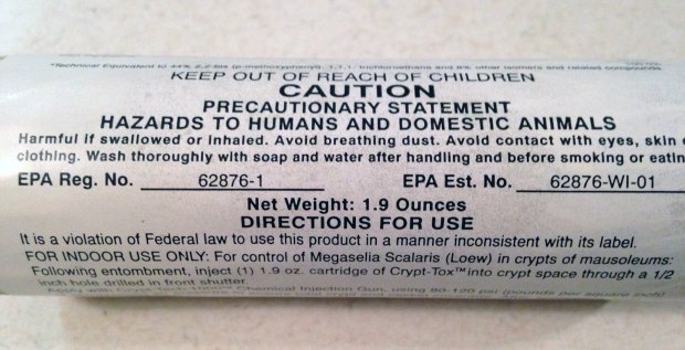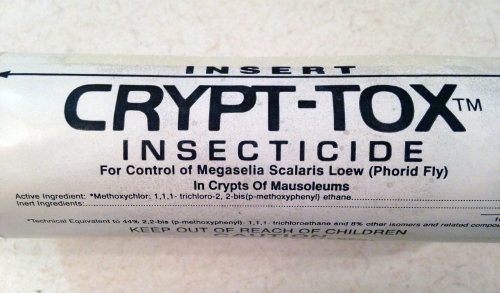 El control de insectos en cementerios tiene miga. Si la lucha hasta hace poco era contra moscas y coleópteros que se alimentan de cadáveres, en la actualidad hay que sumar a la cucaracha americana que ha encontrado en este lugar otro nicho ecológico. Quizás se podrían rescatar herramientas del pasado como la ideada para la aplicación del insecticida Crypt-Tox, creado por la compañía norteamericana Pepcis Corporation para el control de Megaselia scalaris en nichos [1]. Se publicitaba bajo la frase certera «the top gun in mausuleum pest control». Y desde luego lo era, porque estaba formulado con la materia activa metoxicloro al 50%. Se trata de un organoclorado aromático de estructura muy parecida al DDT que fue descubierto hacia 1945. Por tanto tenía una buena persistencia como para apartar a la mosca jorobada de un bocado tan exquisito.