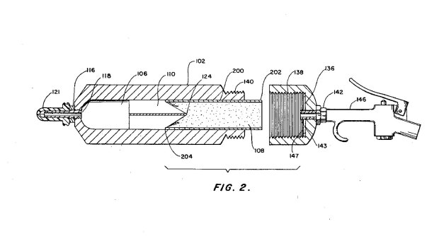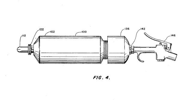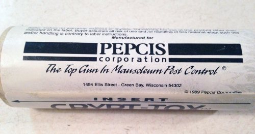 Como se puede ver en las imágenes, Crypt-Tox venía envuelto en un cilindro de cartón que se insertaba en un aparato especialmente diseñado. Más abajo, se pueden ver los dibujos publicados en la patente de este aparato (figuras 5 a 9) [2]. No tiene un diseño complicado. Se trata de una pistola que va conectada a un compresor de aire comprimido. Se inyecta el formulado en polvo en el nicho a través de un orificio practicado en la pared. La patente fue presentada en junio de 1990 y aprobada en septiembre de 1992. Cryp-Tox fue registrado por la US EPA en febrero de 1990 y su registro fue cancelado en marzo de 2001 [3].