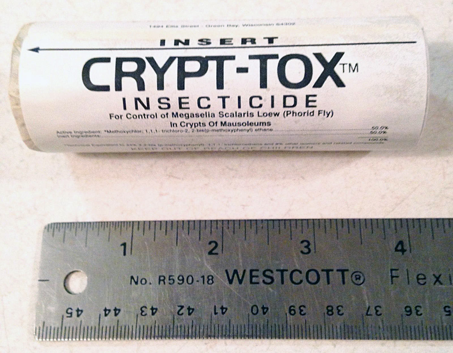 El control de insectos en cementerios tiene miga. Si la lucha hasta hace poco era contra moscas y coleópteros que se alimentan de cadáveres, en la actualidad hay que sumar a la cucaracha americana que ha encontrado en este lugar otro nicho ecológico. Quizás se podrían rescatar herramientas del pasado como la ideada para la aplicación del insecticida Crypt-Tox, creado por la compañía norteamericana Pepcis Corporation para el control de Megaselia scalaris en nichos [1]. Se publicitaba bajo la frase certera «the top gun in mausuleum pest control». Y desde luego lo era, porque estaba formulado con la materia activa metoxicloro al 50%. Se trata de un organoclorado aromático de estructura muy parecida al DDT que fue descubierto hacia 1945. Por tanto tenía una buena persistencia como para apartar a la mosca jorobada de un bocado tan exquisito.