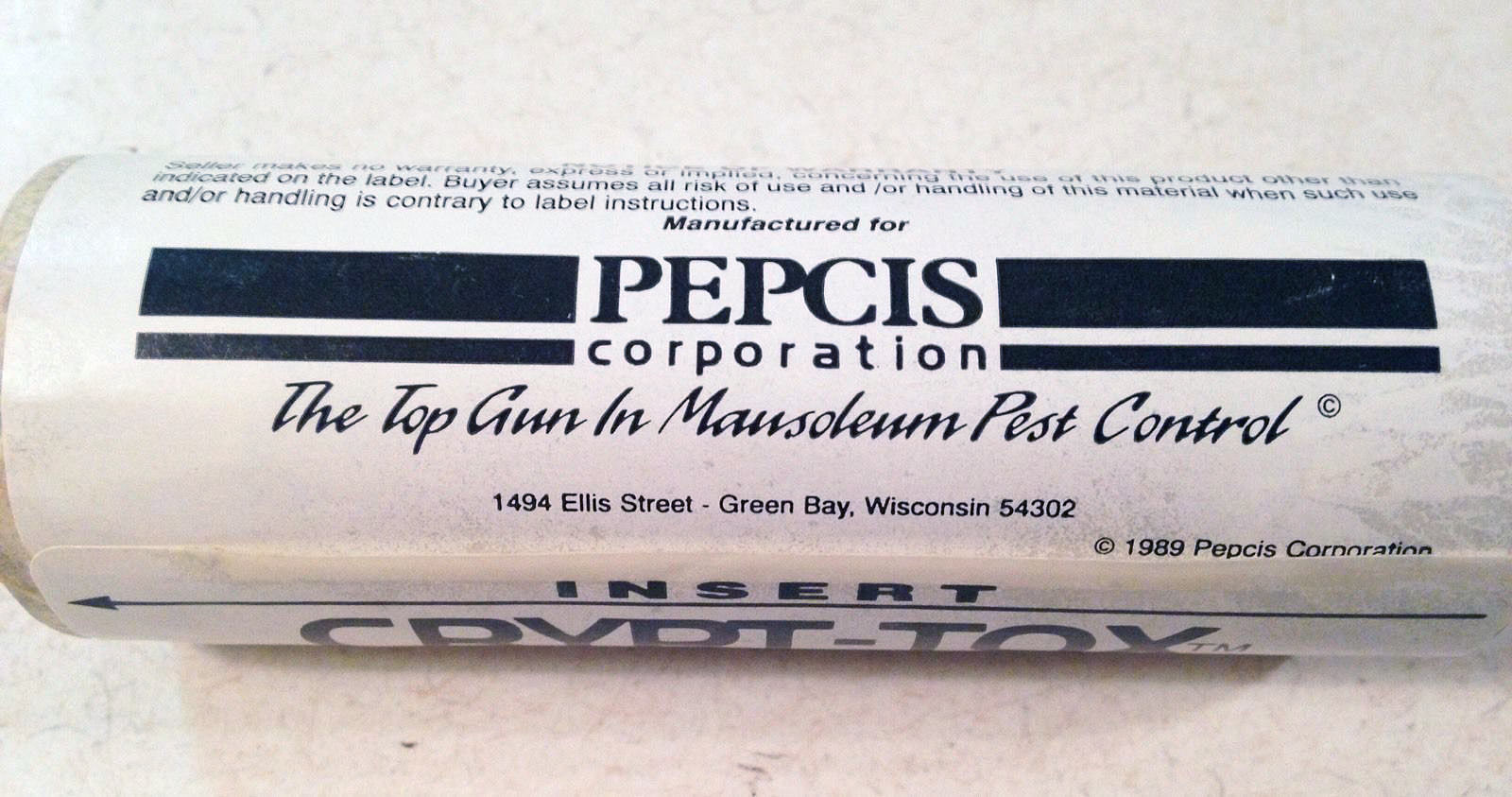 Como se puede ver en las imágenes, Crypt-Tox venía envuelto en un cilindro de cartón que se insertaba en un aparato especialmente diseñado. Más abajo, se pueden ver los dibujos publicados en la patente de este aparato (figuras 5 a 9) [2]. No tiene un diseño complicado. Se trata de una pistola que va conectada a un compresor de aire comprimido. Se inyecta el formulado en polvo en el nicho a través de un orificio practicado en la pared. La patente fue presentada en junio de 1990 y aprobada en septiembre de 1992. Cryp-Tox fue registrado por la US EPA en febrero de 1990 y su registro fue cancelado en marzo de 2001 [3].