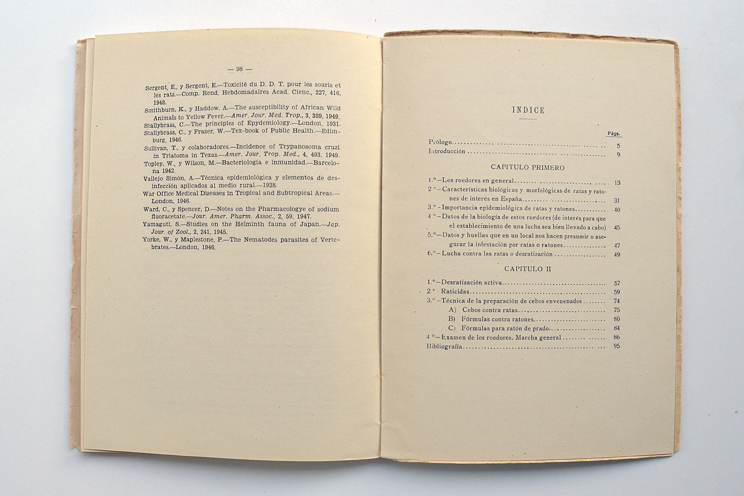 El libro fue escrito por dos motivos. El primero fue por la aparición de los nuevos rodenticidas de origen sintético. El segundo para servir de guía en toda campaña muricida de fines epidemiológicos. Es pues, un libro destinado a personal especializado de la época. El texto se estructura en dos capítulos tal y como se puede ver en el índice (figura 2). En el capítulo primero, se describen los roedores comensales, las enfermedades que pueden ser transmisores, la lucha en general que se puede realizar y la práctica de la desratización pasiva mediante la construcción de edificios a prueba de ratas (rat-proofing).