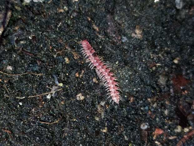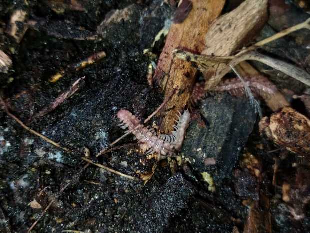 Debajo de la hojarasca o de troncos en descomposición, es fácil encontrar algún milpiés del género Polydesmus. Según consta en relación de fauna del Parc Natural del Montseny [1], la especie común sería Polydesmus coriaceus en zonas de hayas, robles o abetos. Así pues, es bastante probable que los milpiés de las imágenes pertenezcan a esta especie.
