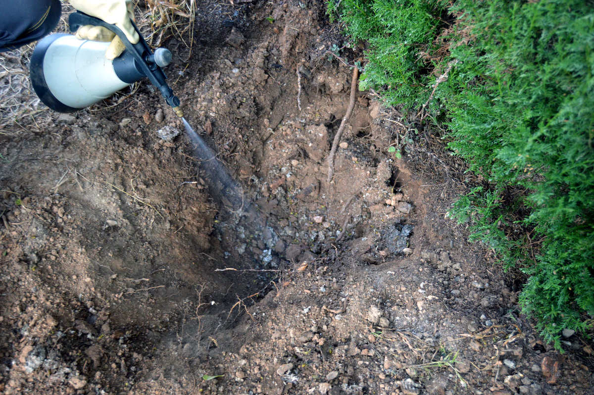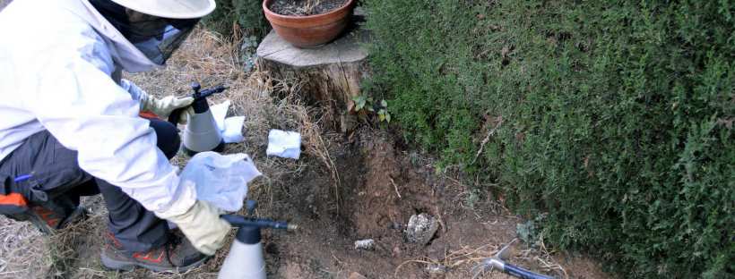 La semana pasada tuvimos un interesante caso de Vespula germanica [1]. En primer lugar, porque retiramos dos nidos de esta especie durante el mes de febrero, cosa que no es habitual en esta época. Como explicación podría servir el hecho de que este invierno está siendo muy cálido. Y esto permitiría la supervivencia de las colonias de Vespula. En segundo lugar, porque los nidos se encontraban en dos propiedades cercanas de la calle Dr. Fleming de Sant Just Desvern. Uno estaba bajo el suelo y, el otro, entre cipreses.