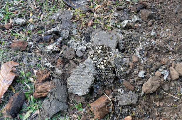 El trabajo fue llevado a cabo por mi compañero Francisco Escuderos y yo. El primer nido que acometimos fue el que se encontraba en el suelo (figuras 1 a 5). Poco a poco fuimos cavando alrededor del nido para extraerlo. Conseguimos eliminarlo, aunque nos llevamos algún picotazo. Este nido estaba bien activo. En las imágenes 6 a 8, se pueden ver individuos que recolectamos para observarlos. Es curioso porque había obreras y/o reinas y machos. Según consta en manuales, V. germanica tiene un ciclo anual. Una reina funda la colonia en primavera. En verano nacerán los reproductores, hembras y machos, y hacia octubre/noviembre se producirá la enjambrazón. Durante una semana aproximadamente, se produce la cópula de los reproductores. Así las futuras reinas disponen del esperma necesario para generar toda la progenie pasado el invierno. Por tanto, en invierno finaliza este ciclo y desaparece la colonia.