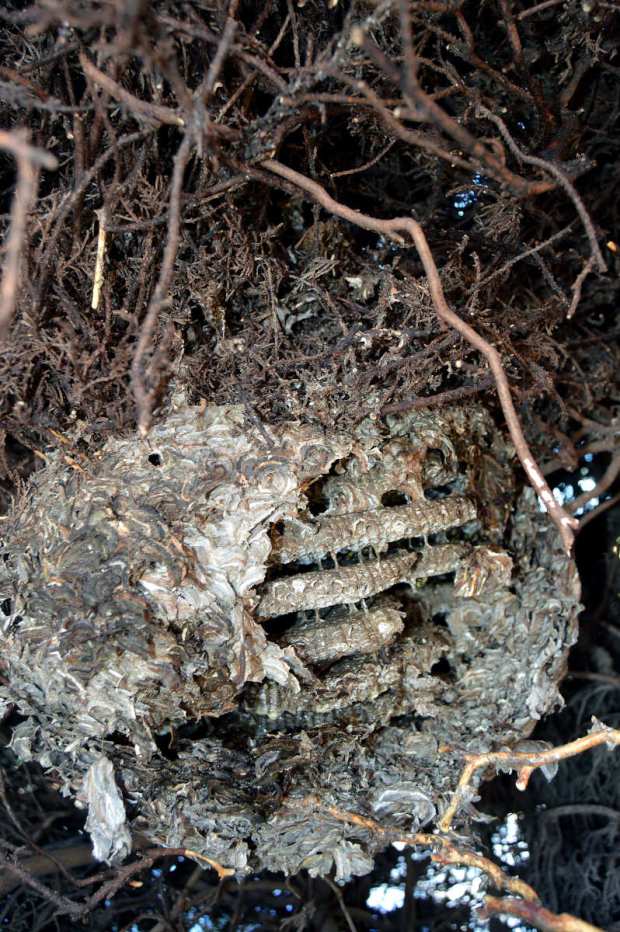 El segundo nido lo localizamos entre cipreses (figuras 9 y 17). No es la primera vez que encuentro un nido en un seto de este tipo. Para que V. germanica instale allí su nido ha de ser tupido como era el caso. Fue fácil eliminarlo porque había pocas avispas. Esta situación es la normal en esta época del invierno, como explicaba antes. En el nido debería quedar algunas obreras que aún sobreviven y, seguramente, alguna reina.