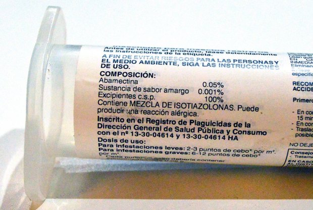 Como he comentado en alguna entrada anterior, la composición de los formulados biocidas es un misterio. Si uno atiende a lo que pone en la etiqueta, tan solo puede encontrar la composición de materias activas. Y el resto de componentes que no se dan a conocer, se despacha bajo la etiqueta «excipientes c.s.p. 100%». A veces, se puede encontrar el nombre de algún aditivo como es el caso del benzoato de bencilo [1], un amargante que aparece bajo la etiqueta «sustancia de sabor amargo». Este aditivo aparece porque al fabricante le interesa mostrar que su producto es seguro para evitar un accidente por vía oral. Y fuera de esto, no aparece nada más.