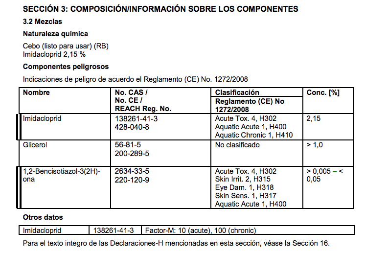 Esto no me parece correcto, porque los formulados biocidas para sanidad ambiental se aplican generalmente en interiores y entran en contacto, en mayor o menor medida, con las personas. La legislación actual permite este oscurantismo que tiene más similitud con la olla de Panorámix del año 50 antes de J.C. que con un pensamiento acorde al siglo XXI. Sin embargo, hay que reconocer que este tupido velo parece que se va corriendo y, en la actualidad, disponemos de mayor información que años atrás. Las fichas de datos de seguridad (FDS) son cada vez más completas y disponen de mayor información. Así pues, en la sección tercera, ahora podemos encontrar la relación de los compuestos considerados peligrosos de un producto químico y su clasificación según el Reglamento CE 1272/2008. Y con esta publicación, se hace evidente una gran contradicción, ya que en la ficha de datos de seguridad aparece una relación de productos peligrosos que no aparece en la etiqueta.
