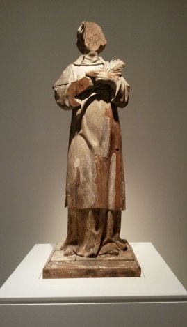 En una exposición sobre la iconoclasia encontré expuesta una talla de madera del siglo XVIII colocada sobre un pedestal. Me llamó la atención. Como se puede ver en la imagen número 1, se trata de la figura de un santo a la que le falta el rostro y parte de una mano. Pero no solo eso, sino que también también le falta el recubrimiento de yeso en algunas partes. Gracias a esto, se puede apreciar cómo se realizaban las tallas.