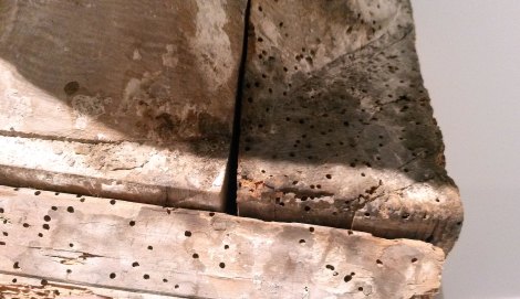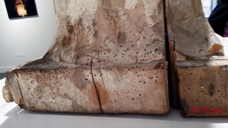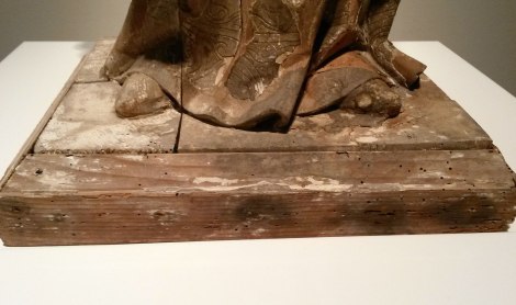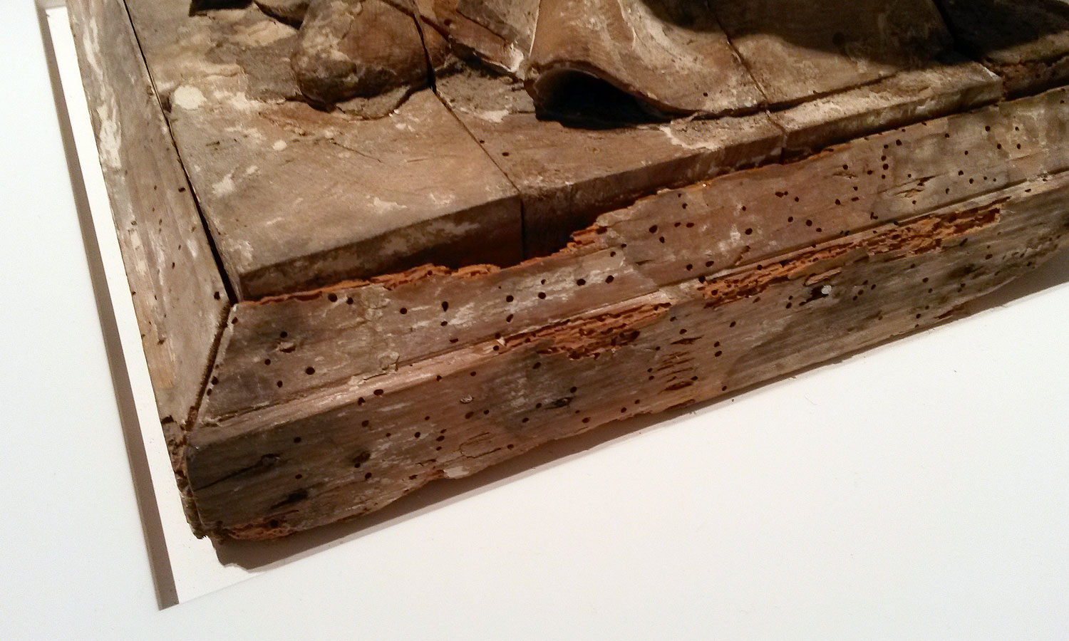 Estuve un rato contemplando la talla. Me parecía fascinante. De hecho, si esta talla hubiera estado en buen estado, quizás no me hubiera parecido interesante. Me hubiera dicho algo así como «otro santo más.» Pero se encontraba allí al principio de la exposición como si un vándalo la hubiera tirado por el suelo. Además de los agentes bióticos humanos, también había participado en la degradación de la madera los anóbidos, lo que conocemos como carcomas. Atacado estaba el pie de la escultura y también la parte trasera, en aquellas zonas en donde no había recubrimiento de yeso y donde la madera era más tierna, en la albura.
