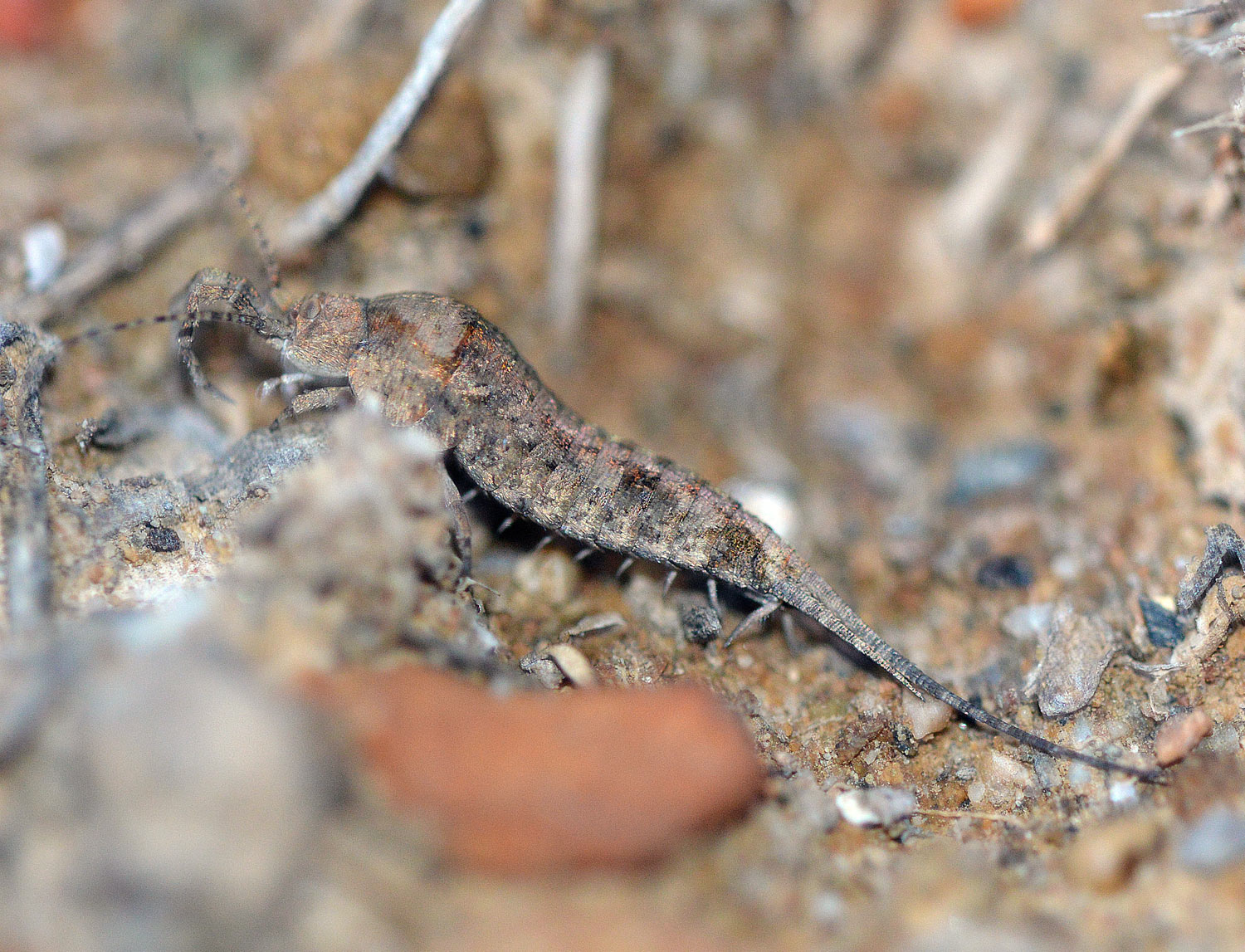 La identificación de estos insectos no es fácil a pesar de que en la Península Ibérica contamos con pocas especies si lo comparamos con otros órdenes. Según Bach de Roda et al. en un artículo de 2015 dedicado a este orden [1], en la Península Ibérica, Baleares, Canarias y Macaronesia contamos con 85 especies repartidas en 15 géneros y dos familias, Machilidae y Meinertellidae. La familia con mayor representación es Machilidae a la cual pertenece el pececillo de cobre de las imágenes. Hago constar que no es fácil la identificación de las especies de este orden. Un factor es que es un grupo bastante homogéneo en cuanto a forma y aspecto.