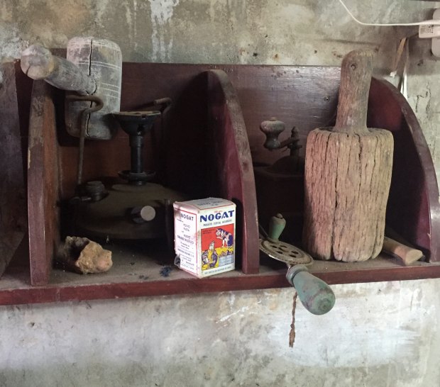 El texto aporta información importante. En primer lugar, sitúa el producto en un contexto agrícola. En la imagen número uno se puede ver la ubicación de la cajita de Nogat en un viejo almacén. Debe de llevar allí 30 o 40 años por lo menos. Es una imagen impagable porque es como un bodegón. De gran belleza es el entorno de herramientas del campo que nos traslada a otra época.
