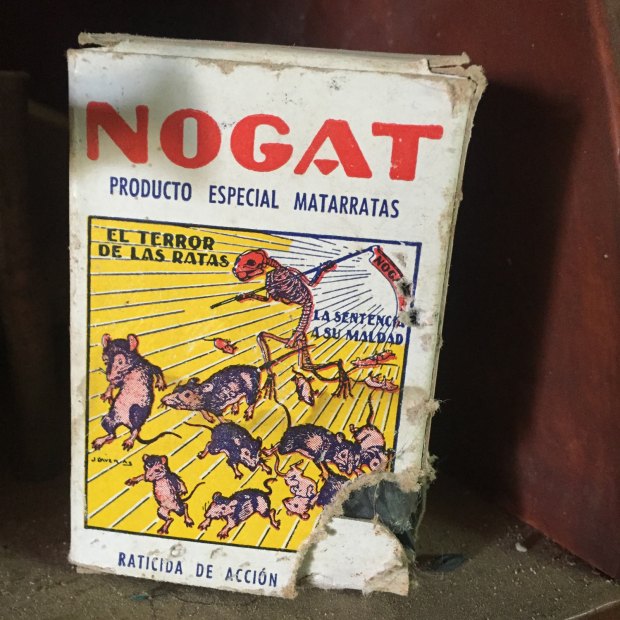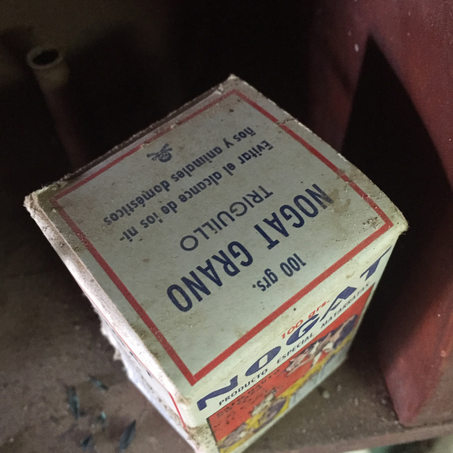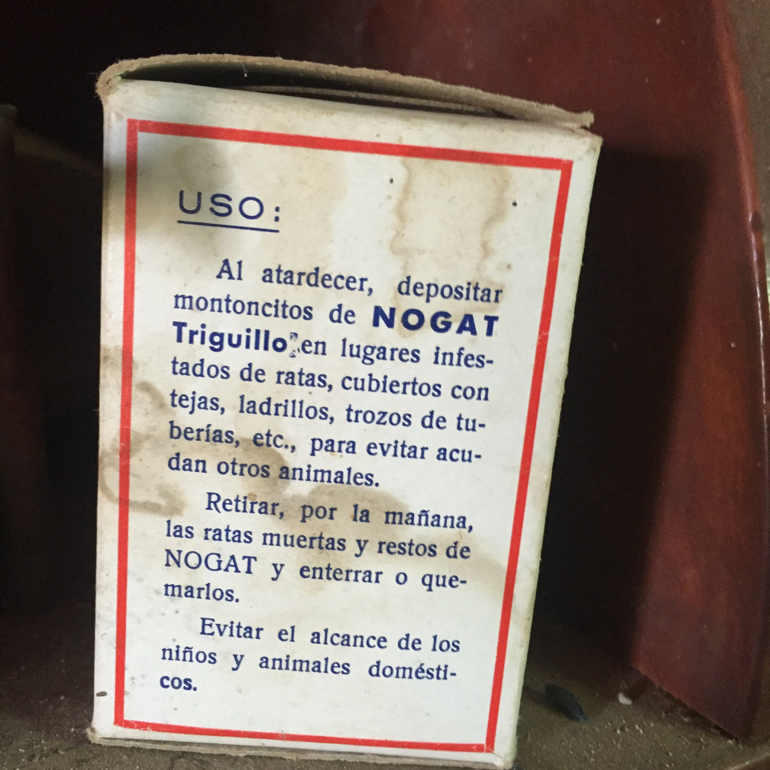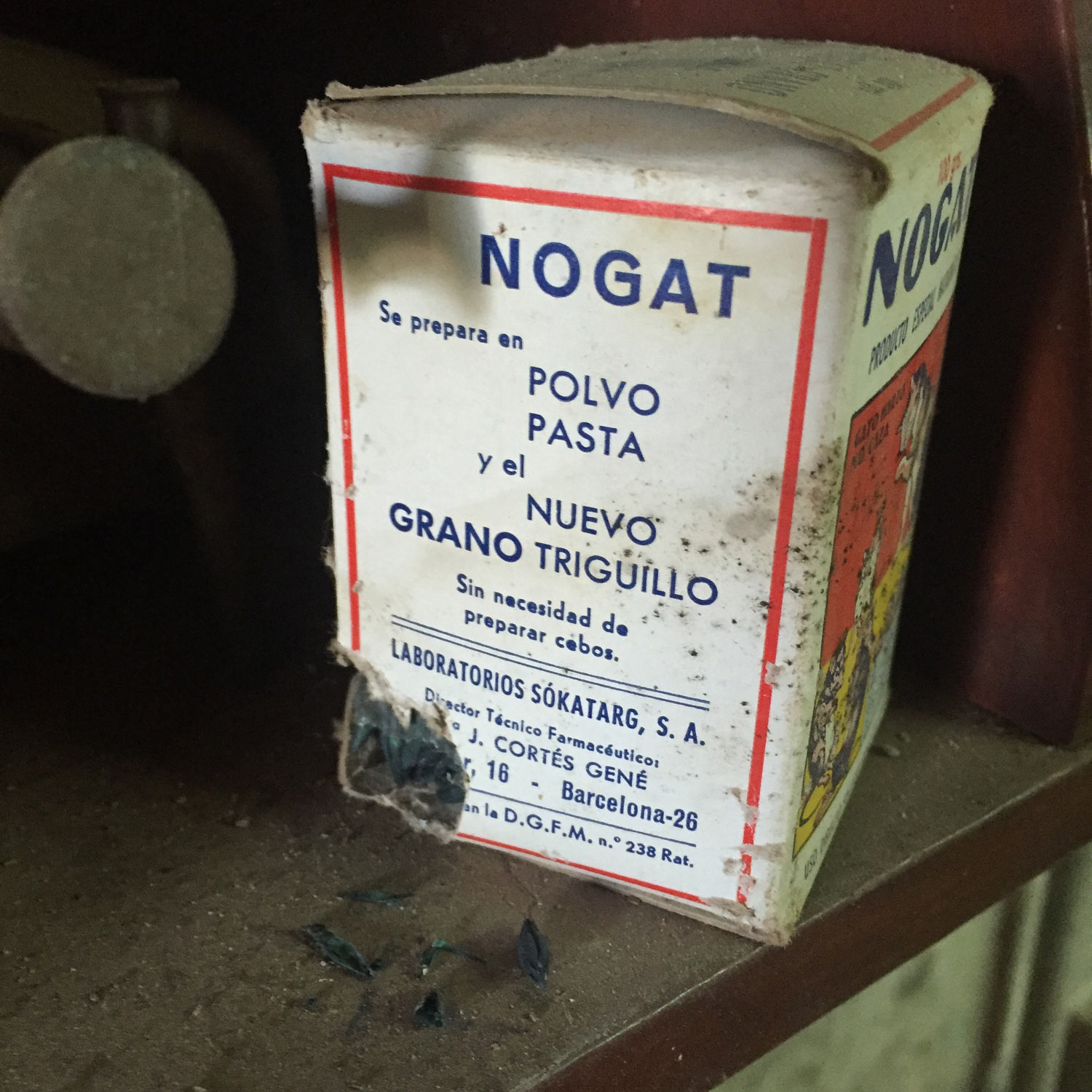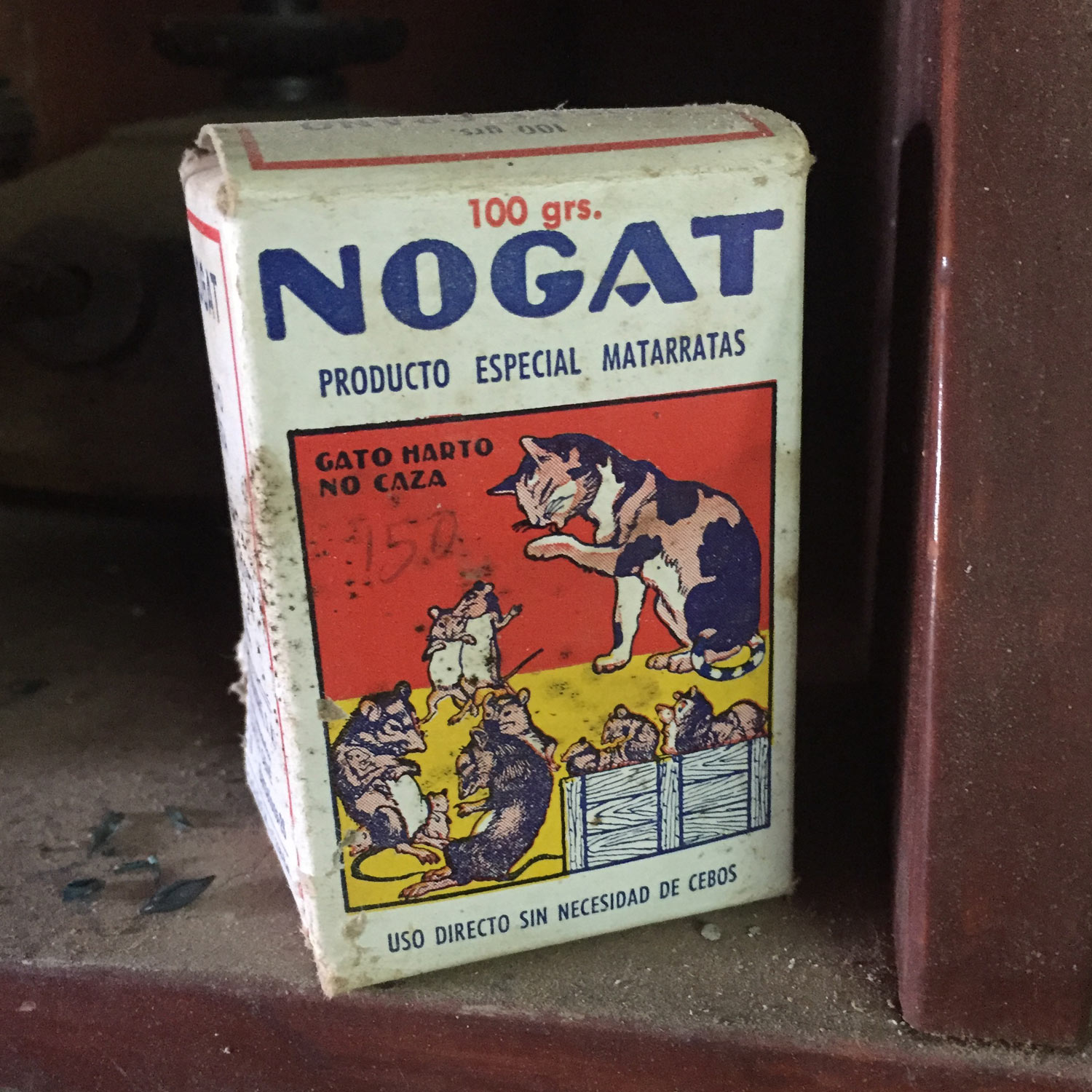 «Te paso unas fotos de una cajita de rodenticida NOGAT, encontrada en un almacén de mi casa de Ibiza, que ha pertenecido a mi familia desde que tengo memoria y uso de razón. Es una casa payesa donde siempre han habido animales y mi abuela, al igual que muchos ibicencos, era fanática de este producto.»