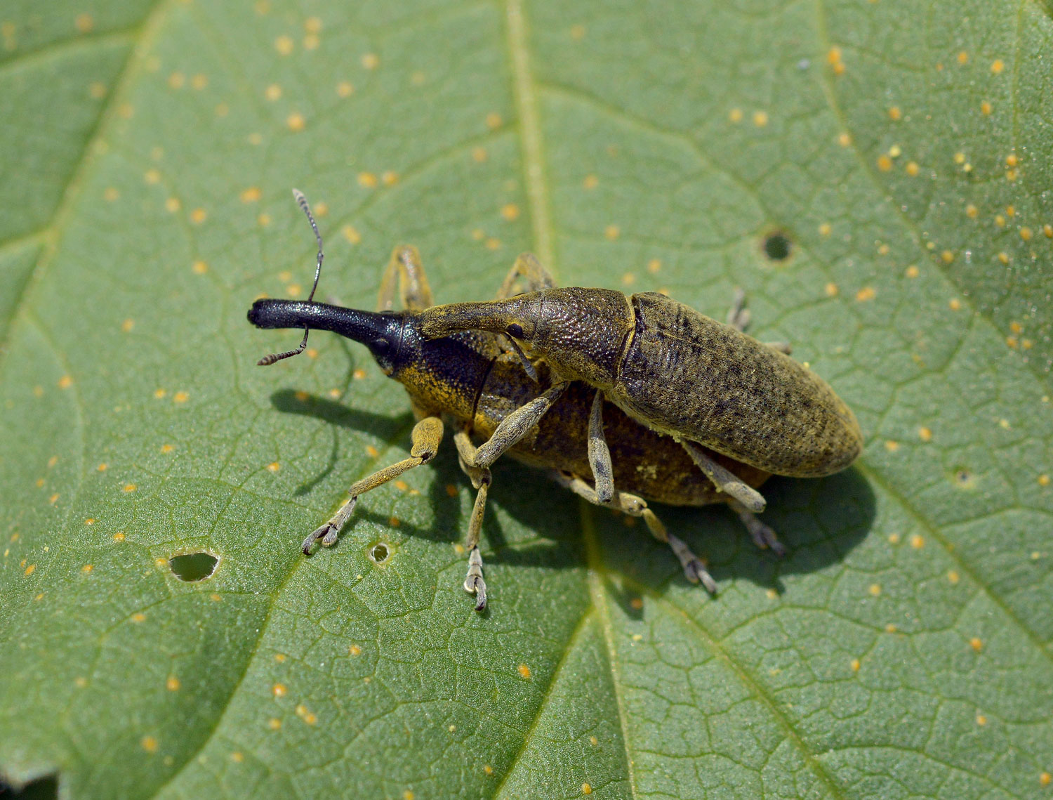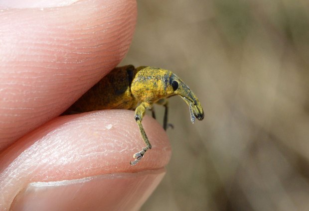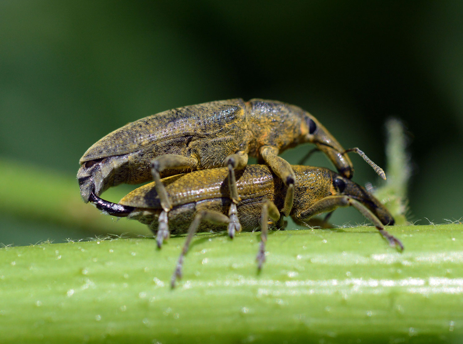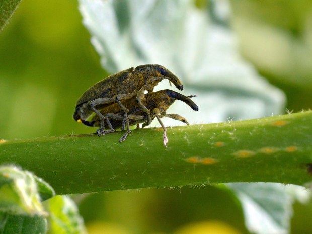 Los escarabajos (Coleoptera) es uno de los órdenes con más especies del reino animal. Y dentro de este orden, la familia de los gorgojos (Curculionidae) es especialmente numerosa y se considera la mayor en número de especies descritas. No es fácil su identificación. Sin embargo, las parejitas de las fotografías tienen toda la pinta de pertenecer a la especie Lixus pulverulentus (también Lixus algirus, denominación antigua). Y es conocida comúnmente conocida como gorgojo de las malvas, aunque desgraciadamente también como gorgojo de las habas por ser plaga de estas leguminosas.