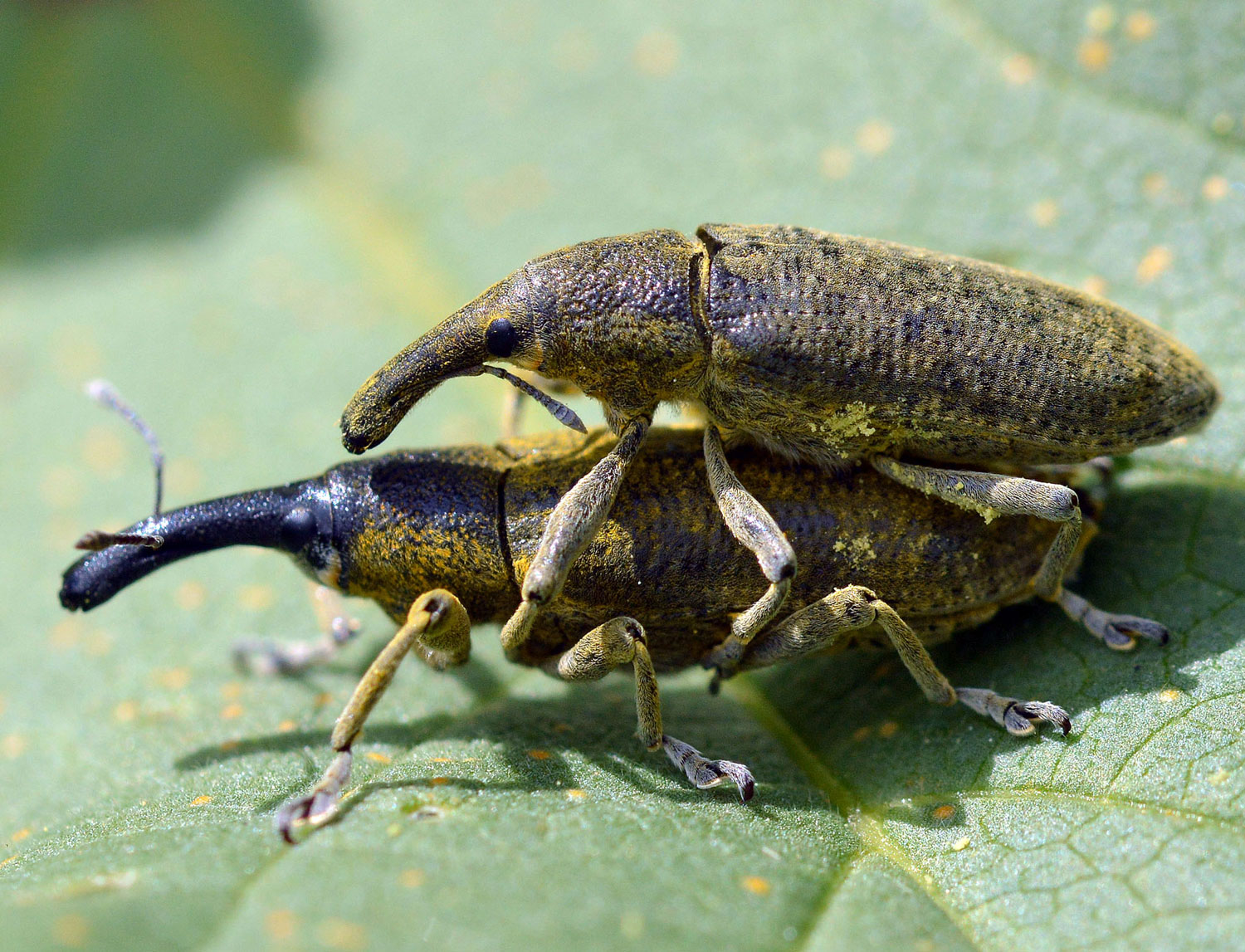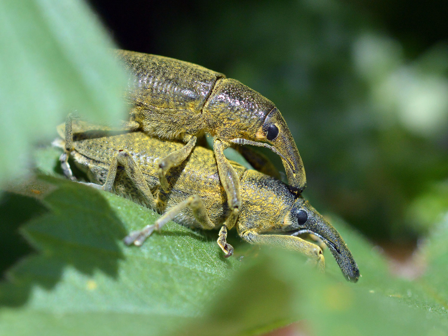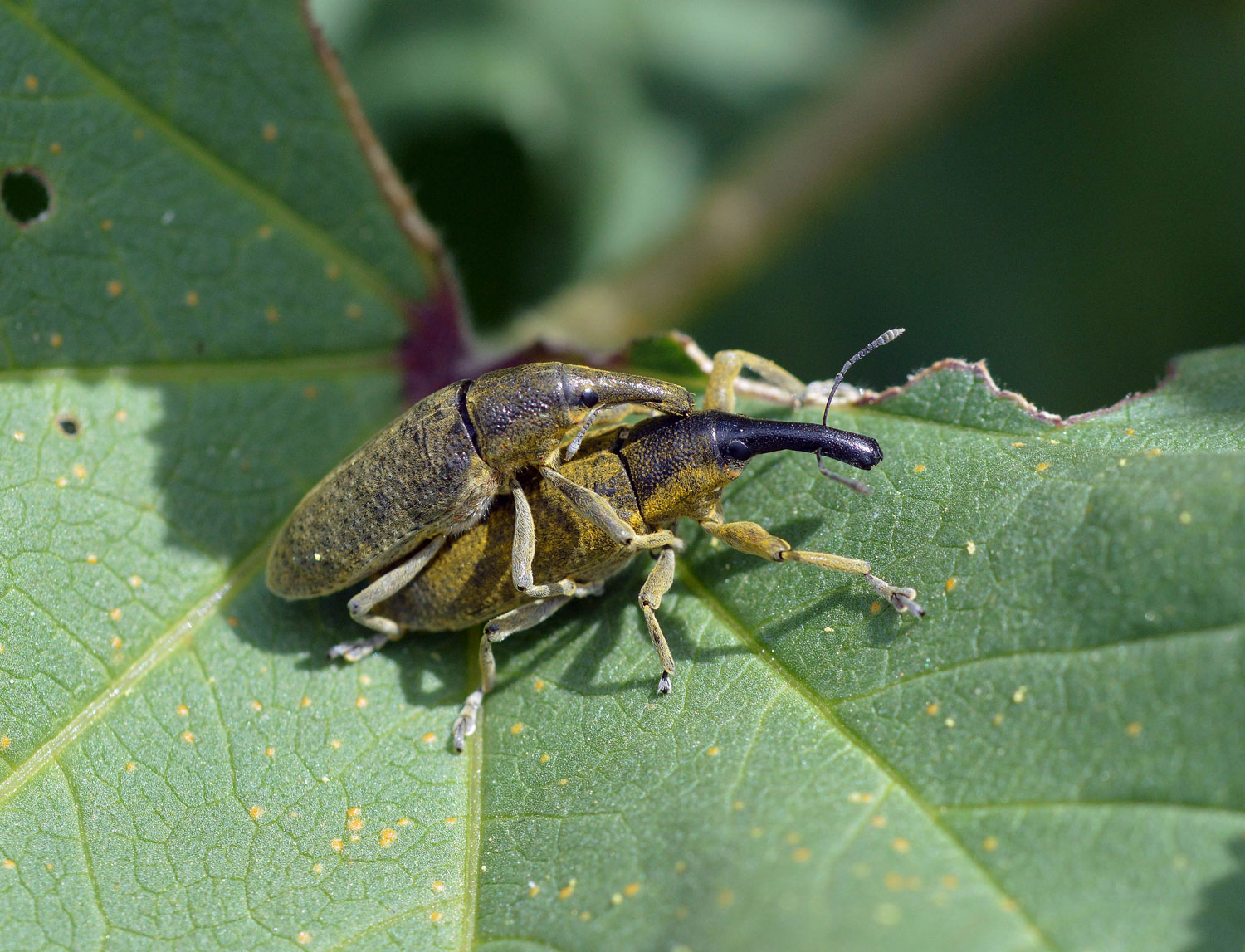 Los escarabajos (Coleoptera) es uno de los órdenes con más especies del reino animal. Y dentro de este orden, la familia de los gorgojos (Curculionidae) es especialmente numerosa y se considera la mayor en número de especies descritas. No es fácil su identificación. Sin embargo, las parejitas de las fotografías tienen toda la pinta de pertenecer a la especie Lixus pulverulentus (también Lixus algirus, denominación antigua). Y es conocida comúnmente conocida como gorgojo de las malvas, aunque desgraciadamente también como gorgojo de las habas por ser plaga de estas leguminosas.