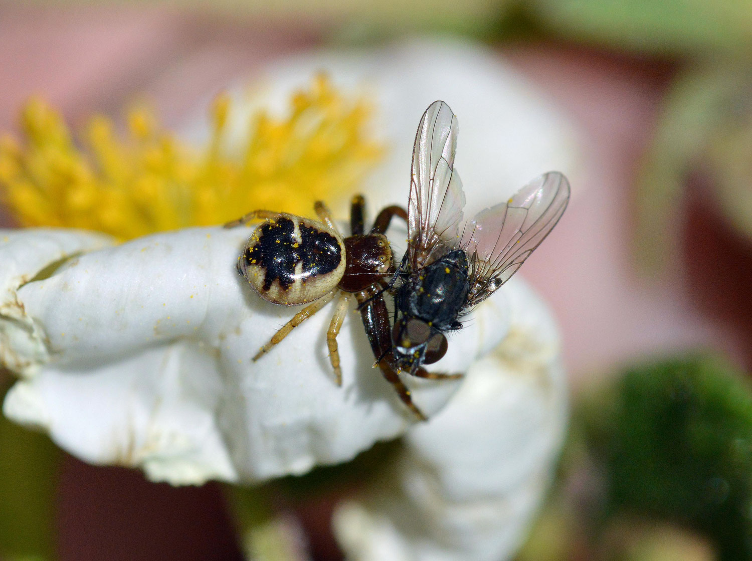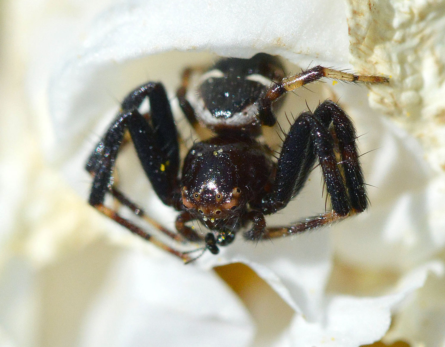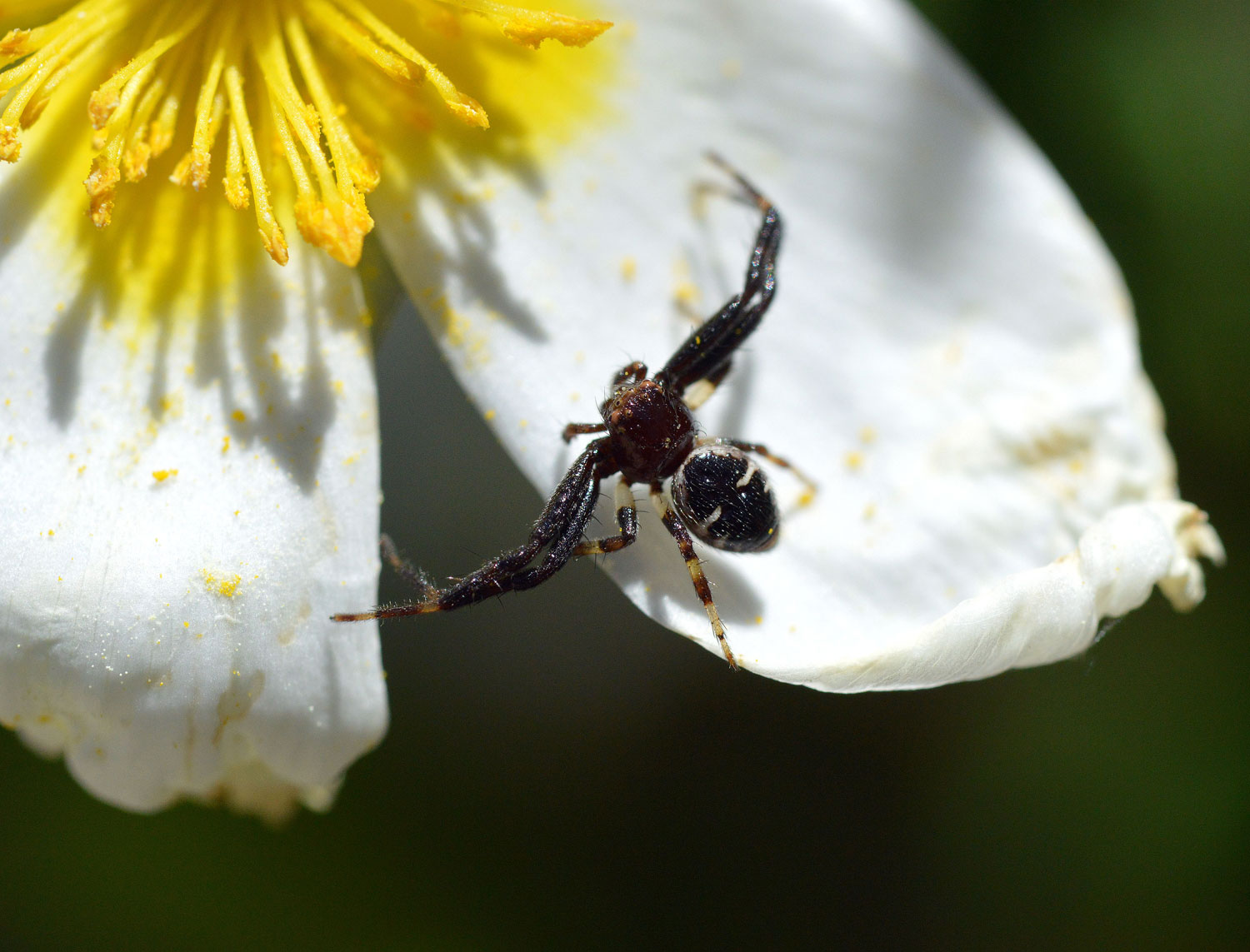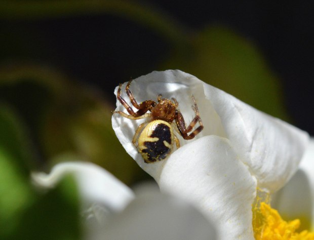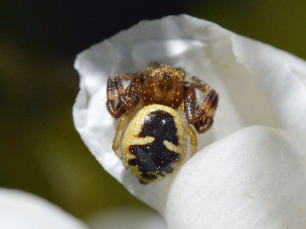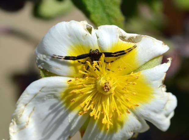 Fig 1. Araña Napoleón, macho al acecho debajo de los estambres./ Desinsectador 2016