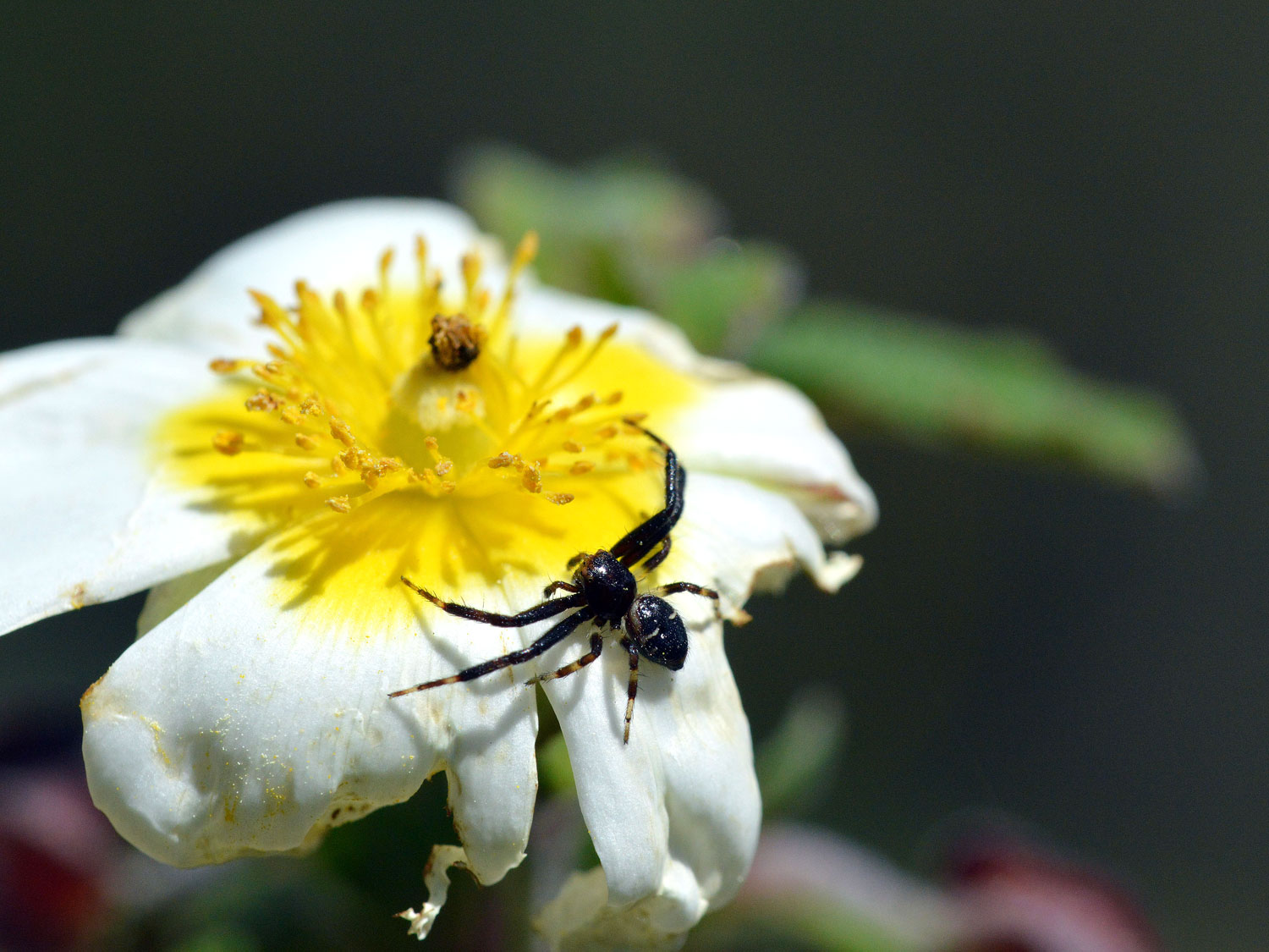 Estuve observando un rato a estas arañas mientras les tomaba fotografías. Es muy interesante la manera que tienen de moverse por la planta. Tienden hilos de seda en los puntos que podríamos definir como atalayas. Y se valen de los hilos para moverse velozmente a la caza de lo que surja. Al acercarme para tomar una foto, las arañas se escondían debajo de la flor. E incluso, si me acercaba de manera abrupta, se tiraban al vacío. Esto me sorprendió. Pensé que se dejaban caer al suelo. Pero luego vi que no era así. A acercarme y sentir ellas la amenaza se lanzaban sujetas por un hilo de seda que había atado a la planta. Entonces caían unos cuantos centímetros y luego trepaban rápidamente por el hilo y se escondían. Magnífico. Buena táctica de evasión.