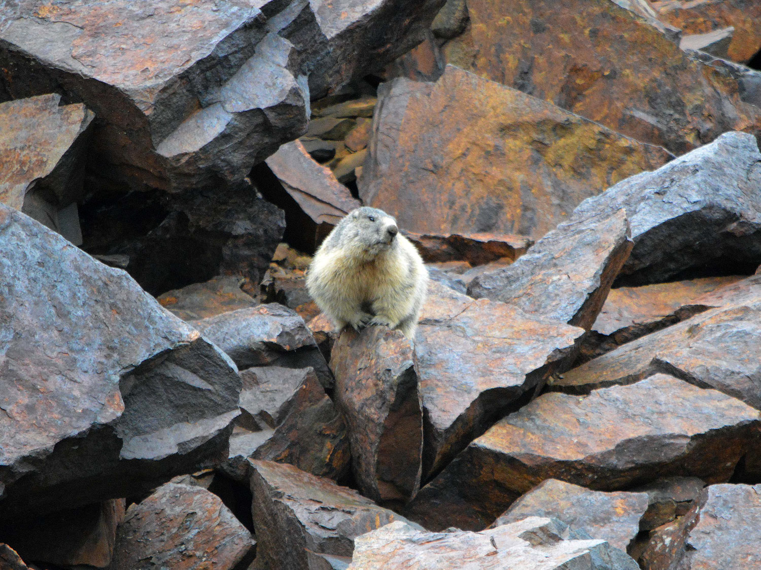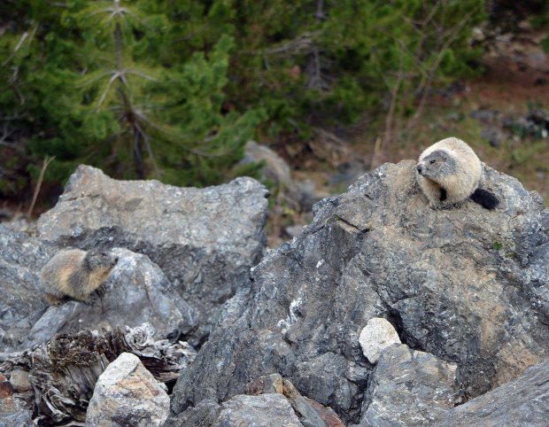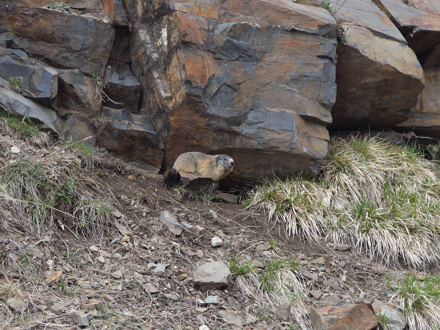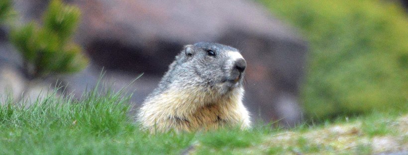 Estamos en el mes de mayo. El calendario marca que las marmotas están en celo. Buscan pareja. Son animales grandes. Por lo menos a mí me lo parecen, estando acostumbrado a tratar con otros roedores como son las ratas de alcantarilla. Miden unos 50 centímetros de largo más 15 centímetro de una cola oscura que parece un plumero. Pueden llegar a pesar hasta 5 kilos y medio. Están bien provistas de un pellejo de tupido pelo que las protege del frío. Esta es una herramienta importantísima para un animal que pasa meses en hibernación en su madriguera. La marmota es graciosa. Al acercarte, corren hacia su madriguera. Entonces se quedan quietas delante de la entrada. Si te acercas más, entran y asoman la cabeza. Te observan y muestran dos grandes incisivos de roedor. Tienen un color amarillo oscuro. Si fueran humanos, diría que fuman una cajetilla al día.