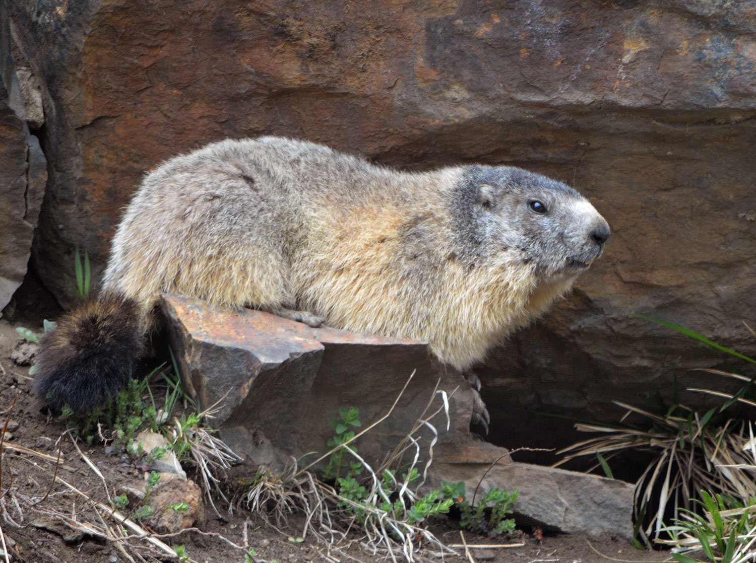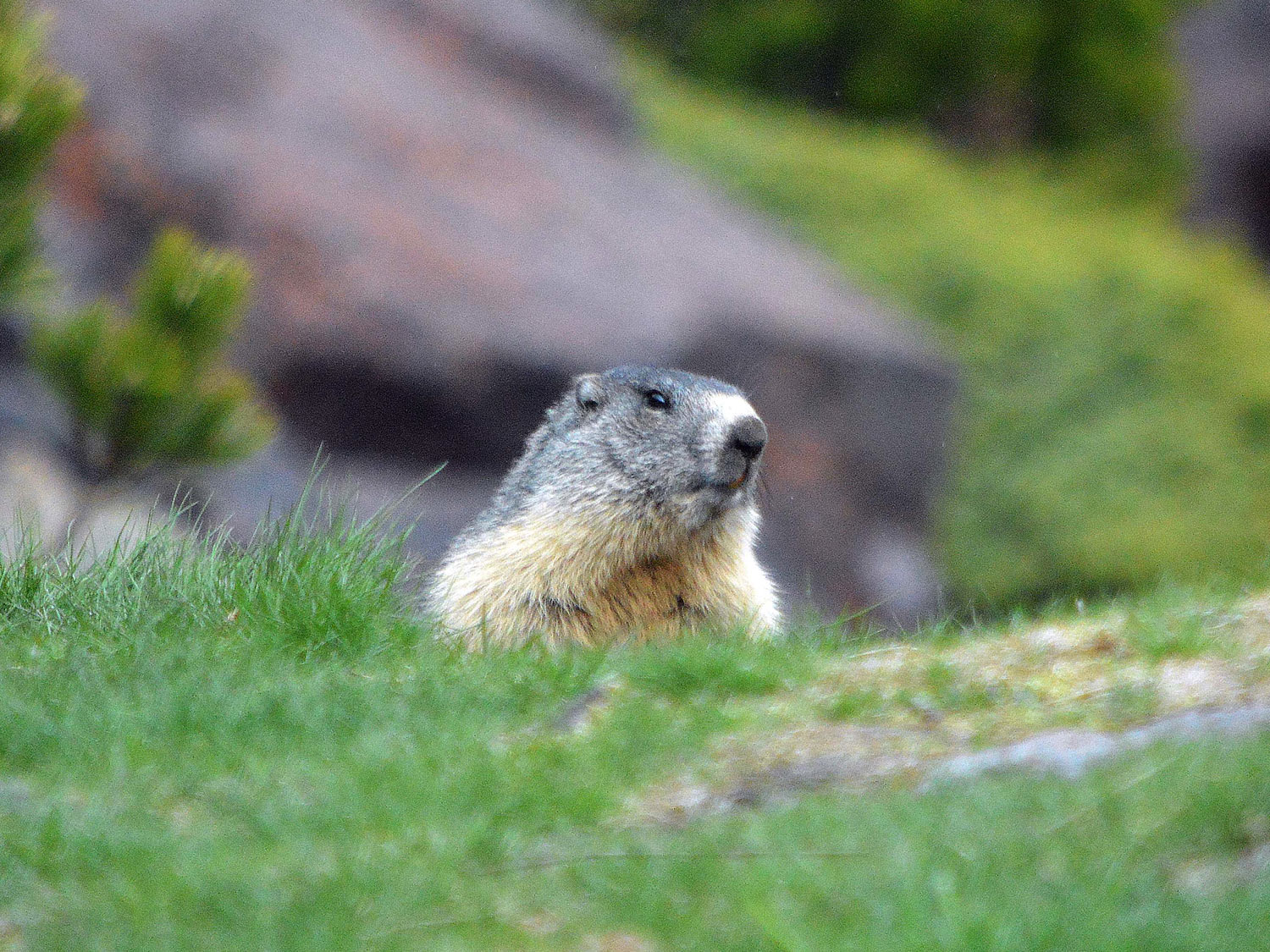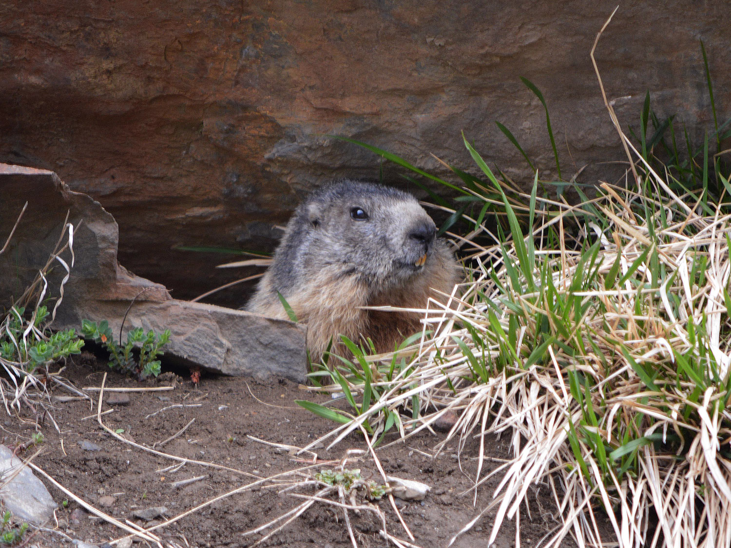 Estamos en el mes de mayo. El calendario marca que las marmotas están en celo. Buscan pareja. Son animales grandes. Por lo menos a mí me lo parecen, estando acostumbrado a tratar con otros roedores como son las ratas de alcantarilla. Miden unos 50 centímetros de largo más 15 centímetro de una cola oscura que parece un plumero. Pueden llegar a pesar hasta 5 kilos y medio. Están bien provistas de un pellejo de tupido pelo que las protege del frío. Esta es una herramienta importantísima para un animal que pasa meses en hibernación en su madriguera. La marmota es graciosa. Al acercarte, corren hacia su madriguera. Entonces se quedan quietas delante de la entrada. Si te acercas más, entran y asoman la cabeza. Te observan y muestran dos grandes incisivos de roedor. Tienen un color amarillo oscuro. Si fueran humanos, diría que fuman una cajetilla al día.