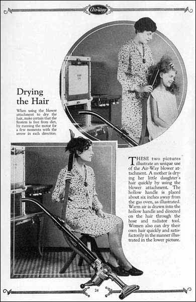 En un manual de instrucciones de un aspirador de la década de 1920 se podían ver imágenes de mujeres que utilizaban el aspirador para secarse el cabello. En la imagen número 2, se puede ver una página del catálogo de un aspirador de la Air-Way Electric Appliance Corporation de Toledo, Ohio, donde aparecen dos fotografías que ilustran este uso inimaginable hoy en día. La Air-Way Electric Appliance fue uno de los fabricantes norteamericanos más importantes de aspiradores de la primera mitad del siglo XX. Esta compañía seguramente no lo tuvo fácil para promocionar el uso del aspirador. Es probable que para dar un impulso a este electrodoméstico imaginó nuevas aplicaciones y pensó que un aspirador también podía servir para aplicar secarse el cabello y aplicar insecticidas. Veamos.