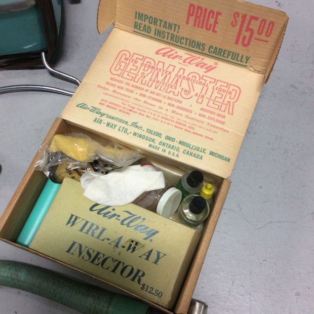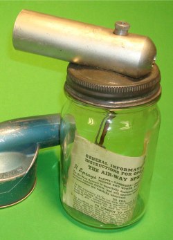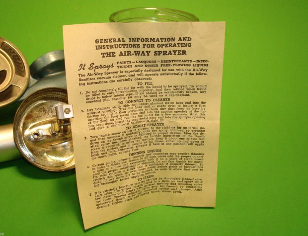 En la imagen número 1, se puede ver una noticia publicada en la revista ‘Scientific American’ de diciembre de 1928. En la sección de inventos para el hogar y bajo el título de ‘Insect Controller’, se reportaba el uso de un aspirador Air-Way para combatir insectos. Como se puede ver en una de las fotografías, se colocaba en un extremo del aspirador un accesorio a modo de dispensador. Tal y como se puede ver en la imagen número 3, este dispensador consistía en un recipiente de vidrio con una tapa enroscada que dejaba caer el producto insecticida en el interior de tubo. El dispensador se acoplaba al aspirador por medio del tubo. Al entrar el aire en el interior, se fraccionaba el producto produciendo una pulverización. Un detalle interesante es que la pulverización se podía controlar mediante un botón que impedía que el líquido cayera en el tubo sin control. Este accesorio fue llamado Air-Way Sprayer. En la imagen número 4, se pueden leer las instrucciones. Además de insecticidas, se podía utilizar para aplicar pinturas y otros líquidos.