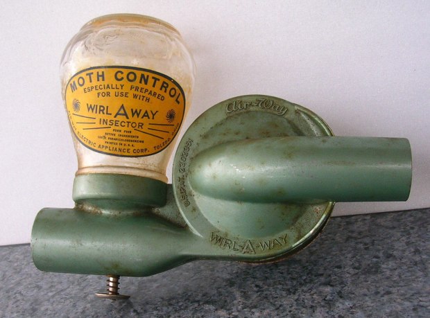 Años más tarde, en noviembre de 1944, la Air-Way Electric Appliance patentó un accesorio para dispensar insecticidas [1]. Se trata de un acesorio muy interesante, porque se diseñó para pulverizar cristales. En concreto, se diseñó para convertir en polvo cristales de paradiclorobenceno contra la polilla de la ropa [2]. Fue llamado Wirl-a-Way Insector. En la imagen número 5, se puede ver el aspecto exterior con un bote acoplado en el que se adquiría el preparado de cristales de paradiclorobenceno en polvo. En la imagen número 6, se puede apreciar el interior, el cual está recubierto de una superficie rugosa para molturar de alguna manera los cristales. La aplicación del producto sería directamente sobre la ropa en el interior de los armarios. Imagino que esto se podría hacer al llegar la primavera y guardar la ropa de invierno. Es muy probable que este producto tuviera éxito, ya que se trataría de una aplicación efectiva para controlar la polilla de la ropa, un insecto muy temido por las amas de casa de entonces. Por otra parte, en tiendas online como Ebay siempre se encuentra a la venta algún Wirl-a-Way Insector, lo cual indica que fueron vendidas un buen número de unidades.