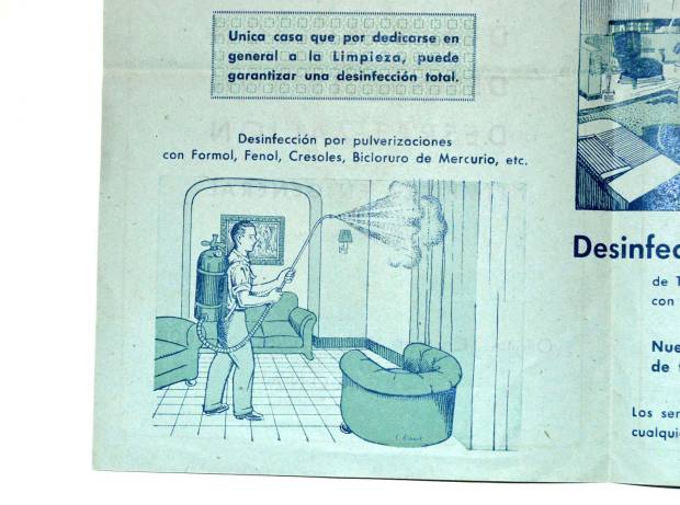 La semana pasada tuve la suerte de encontrar un documento que califico de histórico y que reproduzco al detalle en esta entrada [1]. No sé si puedo transmitir la emoción que me provoca esta hoja publicitaria. Creo que cualquiera que aprecie la historia y tenga curiosidad por el devenir de los hechos podrá comprender y disfrutar de este documento. Se trata de un tríptico de carácter comercial que tiene una espléndida factura [2]. Pero lo realmente interesante es que está ilustrado con dibujos que permiten ver las prácticas de desinfección y desinsectación utilizadas a mediados del siglo XX en España. Y además se mencionan los productos empleados.