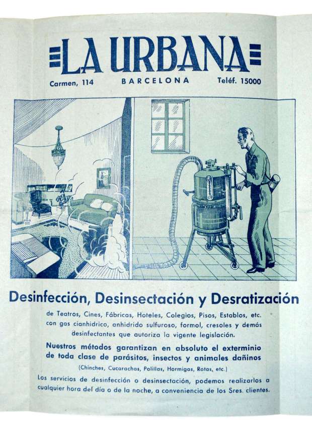 En el tríptico se puede leer esto: «Única casa que por dedicarse en general a la limpieza, puede garantizar una desinfección total.» Parece que La Urbana empezó con la limpieza y amplió negocio con la desinfección. Lo que no sé es si llegó a la quiebra del año 2000 realizando algún tipo de tratamiento DDD o solo realizaba servicios de limpieza. Visto esto, esta empresa fue de las primeras de las que tengo constancia que desde el ámbito de la limpieza hizo una incursión en el control de plagas.