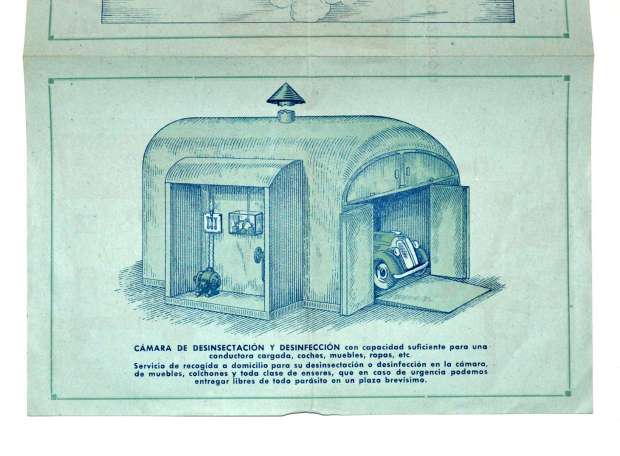 La Urbana, tal y como se puede leer en el tríptico, fue una empresa autorizada por la Dirección General de Sanidad para las prácticas DDD. Desde la primera legislación sobre control de plagas en la década de 1920 hasta la década de 1960, las empresas DDD tenían que estar autorizadas y además los aplicadores debían tener formación específica. Seguramente, habría empresas que realizaban estas prácticas al margen de la legalidad. En el sector es conocido el caso de los mochileros, tan abundantes años atrás. Pero hay que entender que, hasta la llegada de los insecticidas sintéticos (organoclorados), las desinsectaciones se realizaban con productos muy venenosos como era el caso del ácido cianhídrico. De hecho, en el tríptico se pueden ver ilustraciones de aplicación de este gas. En la imagen número 8, se puede ver un hombre aplicando este ácido con una máquina cianhidrizadora en una vivienda. Luego, en la imagen número 10, se puede ver el dibujo de una cámara de desinsectación. Rápido y práctico. Entraba un vehículo, se cerraba la puerta, se aplicaba el gas y fuera. El dibujo es magnífico. Y en la imagen número 11, se describe una práctica fitosanitaria de desinsectación de árboles con entoldado, lo cual da cuenta de que La Urbana también trabajaba en aplicaciones agrícolas. Como ya he indicado en otras entradas, la aplicación del ácido cianhídrico empezó en el campo en la década de 1910 para pasar en la siguiente década al ámbito urbano [6].