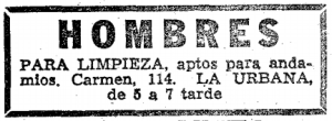 En el tríptico se puede leer el nombre de la empresa que se presenta como La Urbana de Limpieza y Desinfección. Aunque esta empresa también se presentaba de manera abreviada como La Urbana. He estado buscando información sobre esta empresa. He encontrado poco. En enero de 1961, la Dirección General de Sanidad publicó la lista de empresas autorizadas para la realización de trabajos de desinsectación en locales y medios de transporte [3]. En esta lista aparece la empresa nombrada bajo la denominación Desinfecciones La Urbana para trabajar en la provincia de Barcelona. En junio de 1961 fue publicado un anuncio en la sección de clasificados de La Vanguardia en la que La Urbana solicita personal de limpieza (figura 3). En el libro ‘Industria y comercio de los pesticidas’ de 1963 [4], aparece bajo el nombre simplemente de La Urbana como empresa autorizada para labores de desinsectación y para la realización de desinfecciones según el reglamento de epizootias de la Dirección General de Ganadería. En este libro aparece la calle Carmen 114 de Barcelona como domicilio social. Y también aparece el nombre de José Torres Garcés, del cual no he encontrado información alguna, pero que entiendo que se trata del empresario. Estos son todos los datos que he encontrado de esta empresa. Aunque, investigando un poco sobre la verdadera razón social de la empresa, me parece que podría ser el de Limpiezas La Urbana SL, empresa barcelonesa que quebró en el año 2000 [5]. Con lo cual, parece que en ese año finalizó la historia de una empresa con una trayectoria de más de medio siglo.