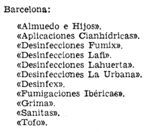 [3] Resolución de la Dirección General de Sanidad por la que se publica la relación de Institutos Provinciales de Sanidad, Laboratorios Municipales y Empresas privadas que han sido autorizados para realizar trabajos de desinsectación de locales y medios de transporte. Ministerio de la Gobernación. Boletín Oficial del Estado, núm. 28, de 2 de febrero de 1961, páginas 1654 a 1655.