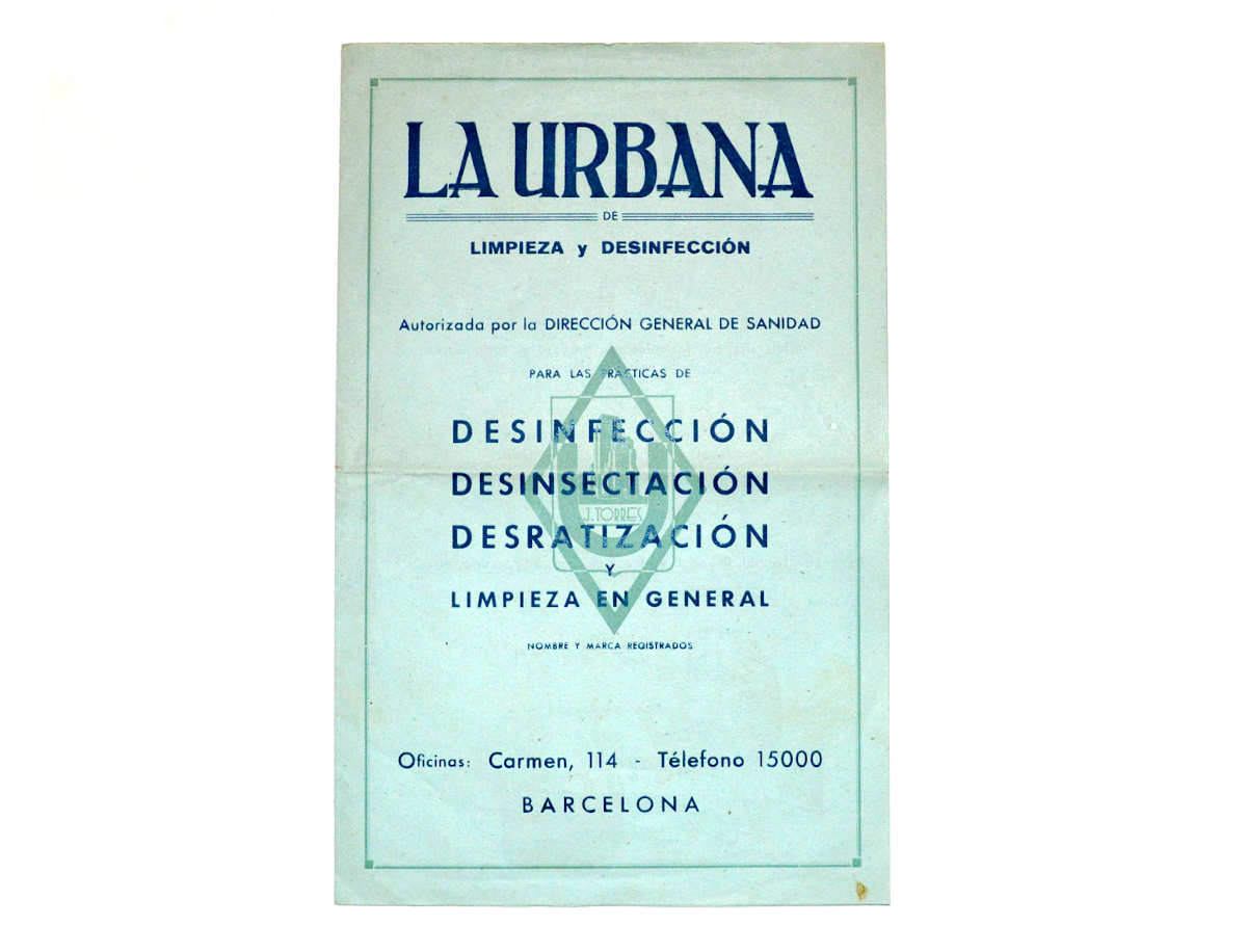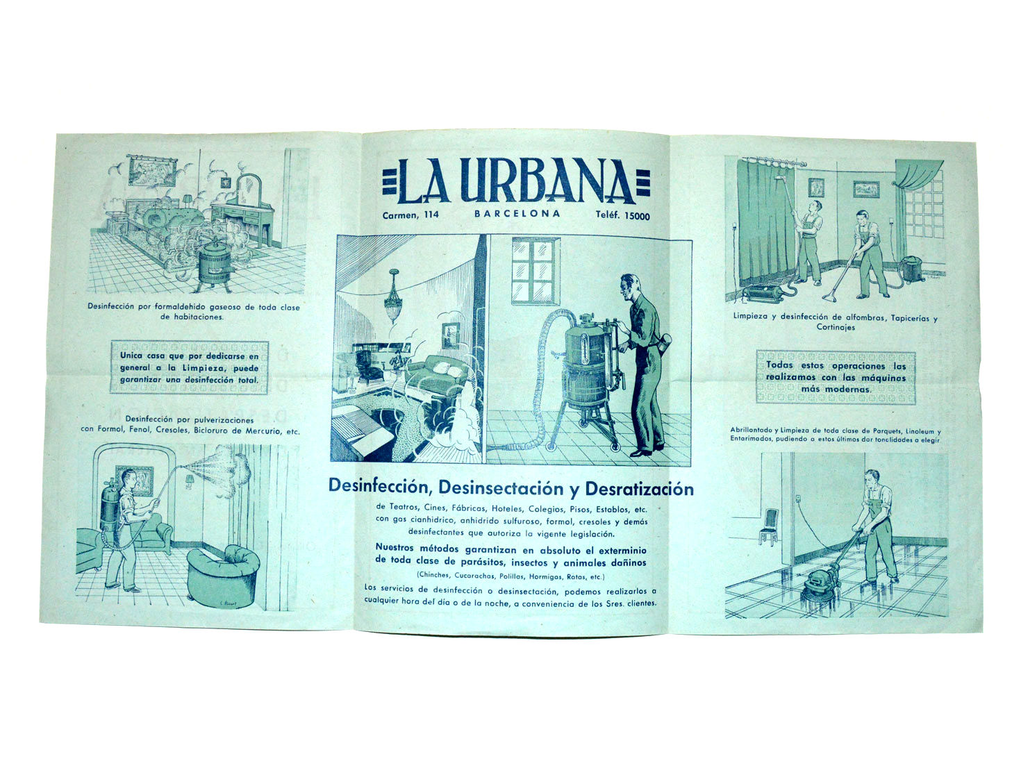En el tríptico se puede leer esto: «Única casa que por dedicarse en general a la limpieza, puede garantizar una desinfección total.» Parece que La Urbana empezó con la limpieza y amplió negocio con la desinfección. Lo que no sé es si llegó a la quiebra del año 2000 realizando algún tipo de tratamiento DDD o solo realizaba servicios de limpieza. Visto esto, esta empresa fue de las primeras de las que tengo constancia que desde el ámbito de la limpieza hizo una incursión en el control de plagas.