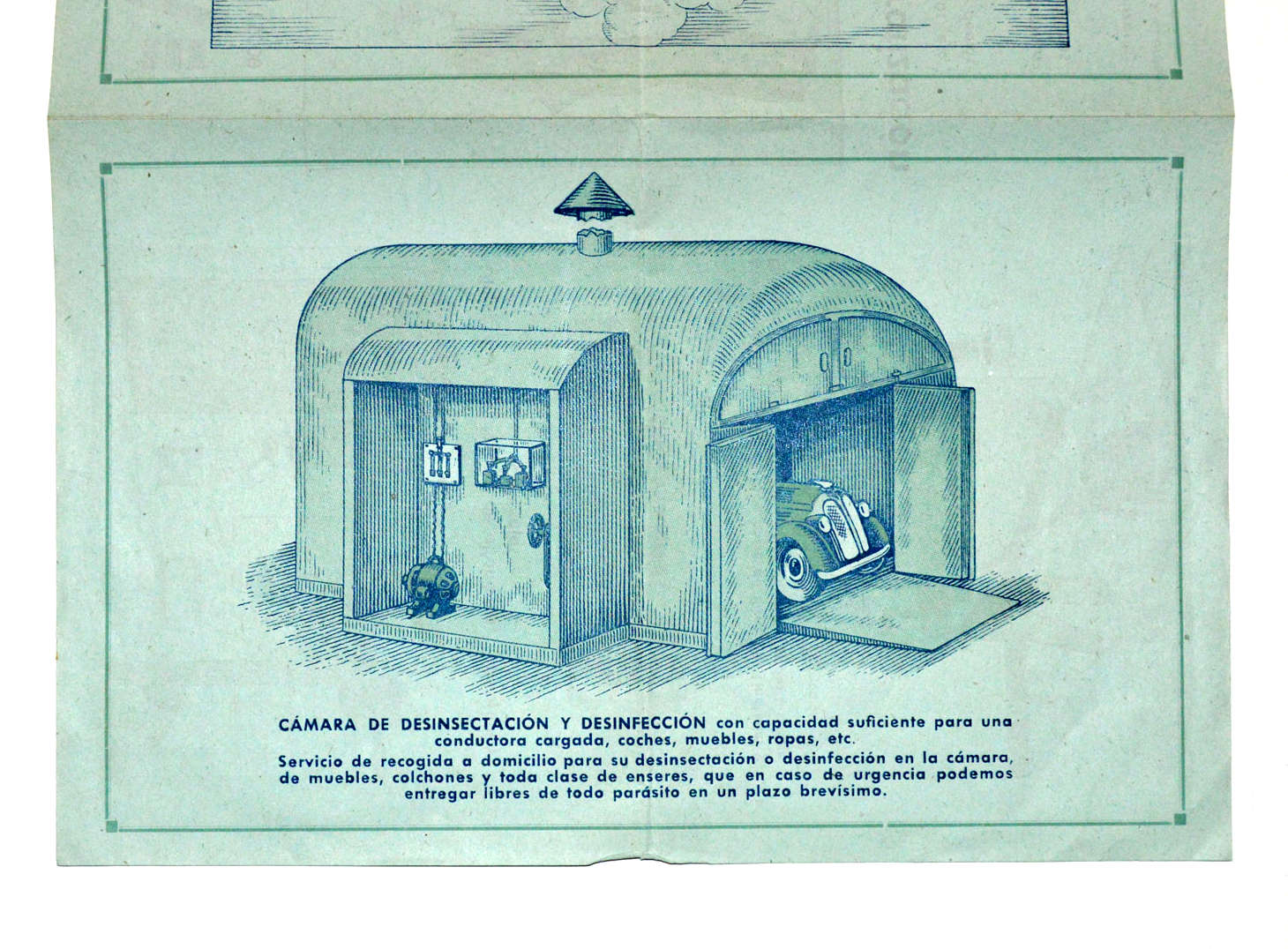 La semana pasada tuve la suerte de encontrar un documento que califico de histórico y que reproduzco al detalle en esta entrada [1]. No sé si puedo transmitir la emoción que me provoca esta hoja publicitaria. Creo que cualquiera que aprecie la historia y tenga curiosidad por el devenir de los hechos podrá comprender y disfrutar de este documento. Se trata de un tríptico de carácter comercial que tiene una espléndida factura [2]. Pero lo realmente interesante es que está ilustrado con dibujos que permiten ver las prácticas de desinfección y desinsectación utilizadas a mediados del siglo XX en España. Y además se mencionan los productos empleados.