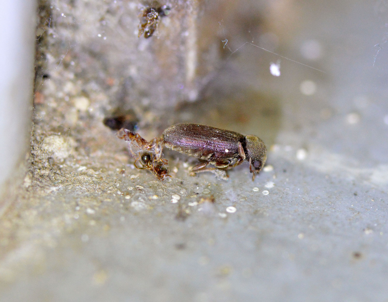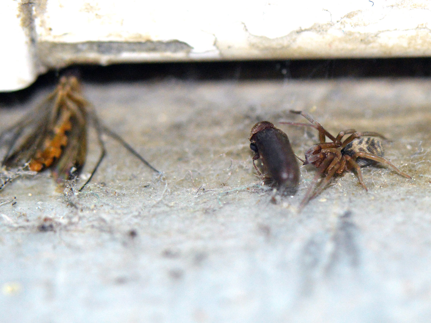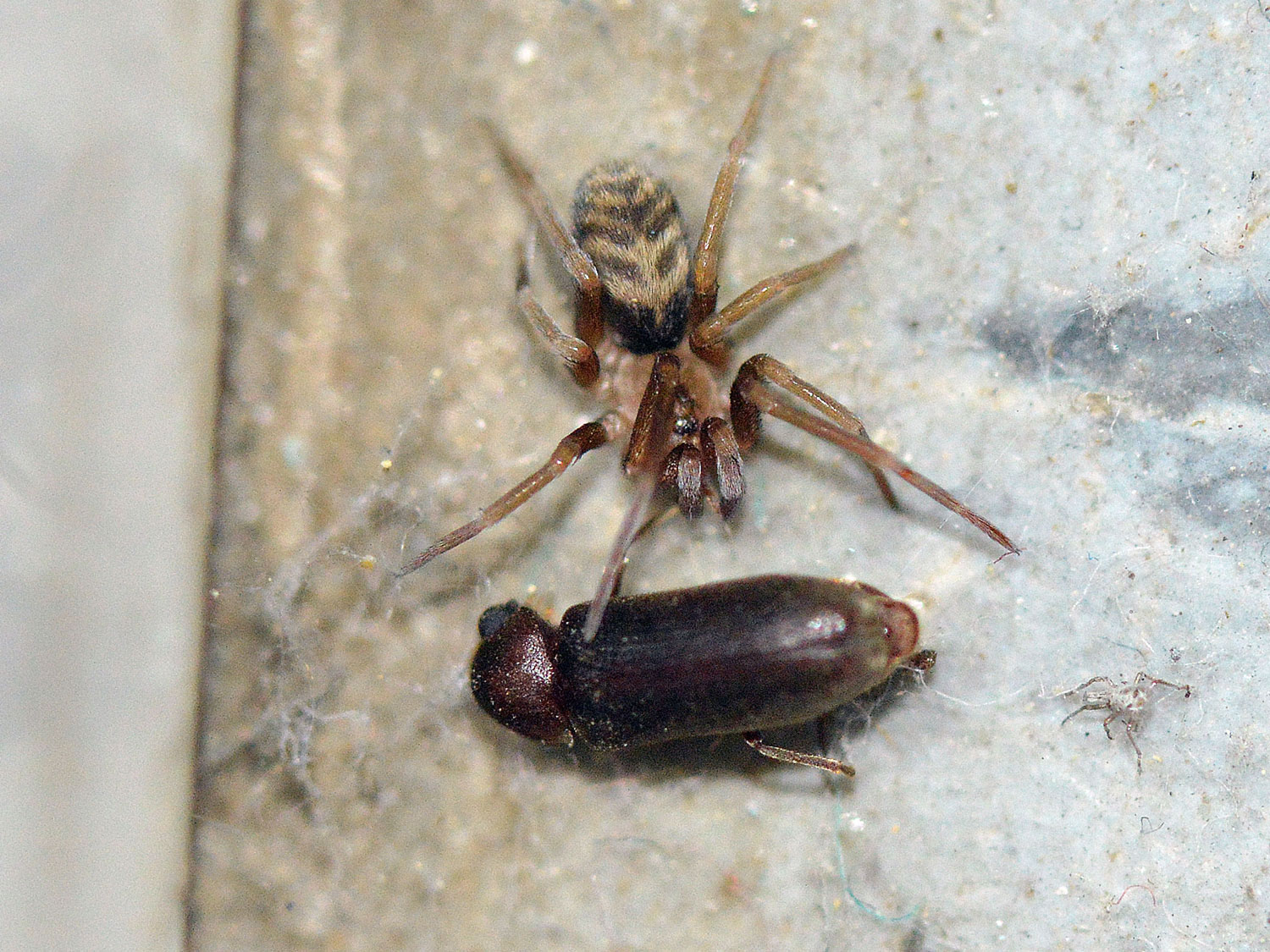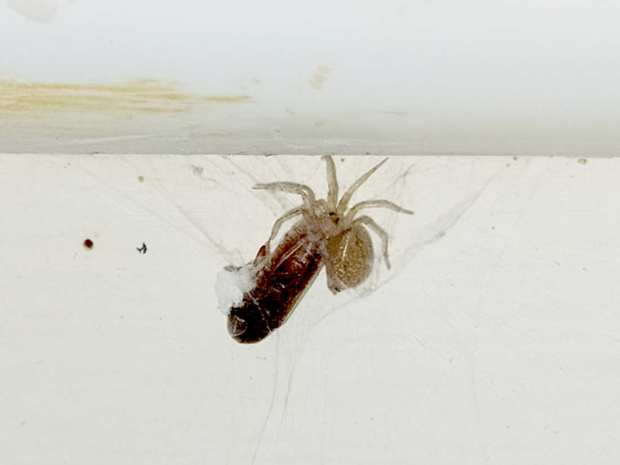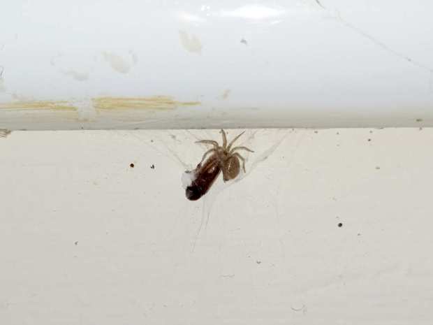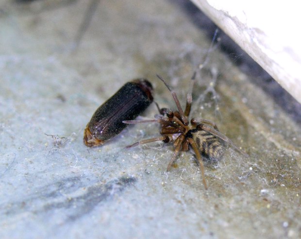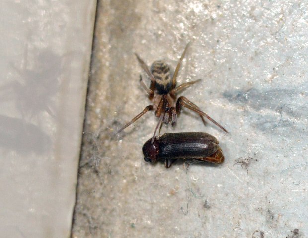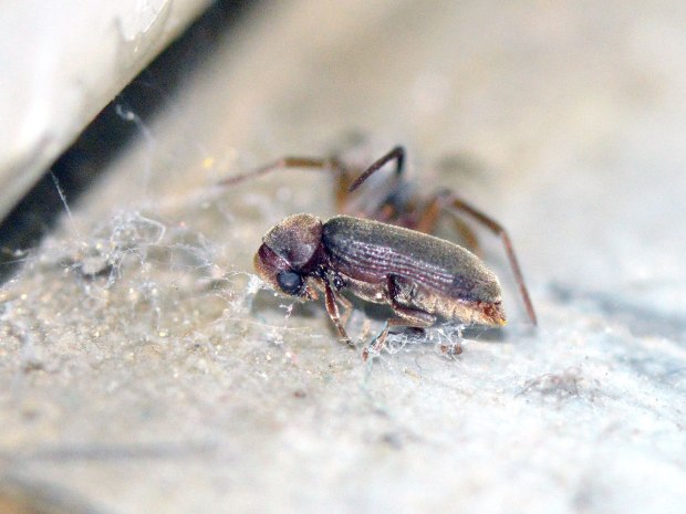 En las imágenes, junto a una carcoma moribunda, se puede ver una pequeña araña. Si el tamaño medio de Oligomerus ptilinoides es entre 5 y 8 mm, uno se puede dar idea de lo pequeña que es. Sin embargo, allí estaba, junto a su presa esperando hacerse con el botín. Había otras arañas, pero eran las típicas que podemos encontrar en interiores de viviendas, así que dirigí mi mirada hacia la que no me parecía habitual en interiores.